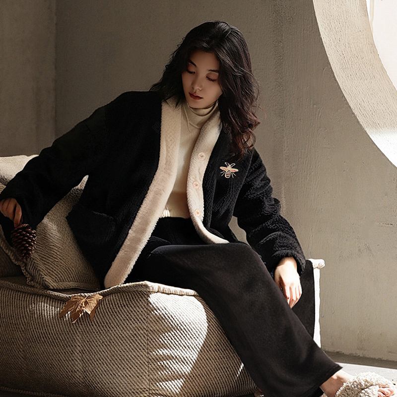 睡衣女秋冬款2024新款珊瑚绒黑色毛毛可外穿加厚大码胖mm家居服