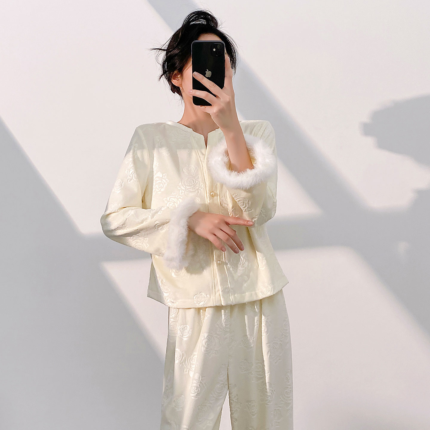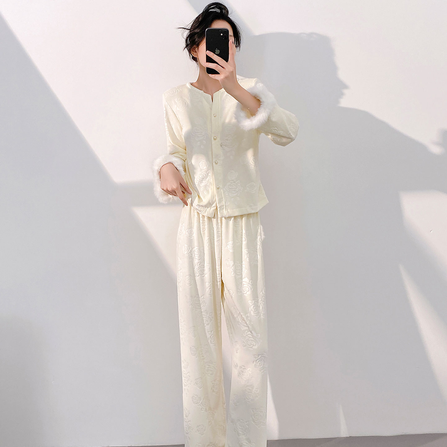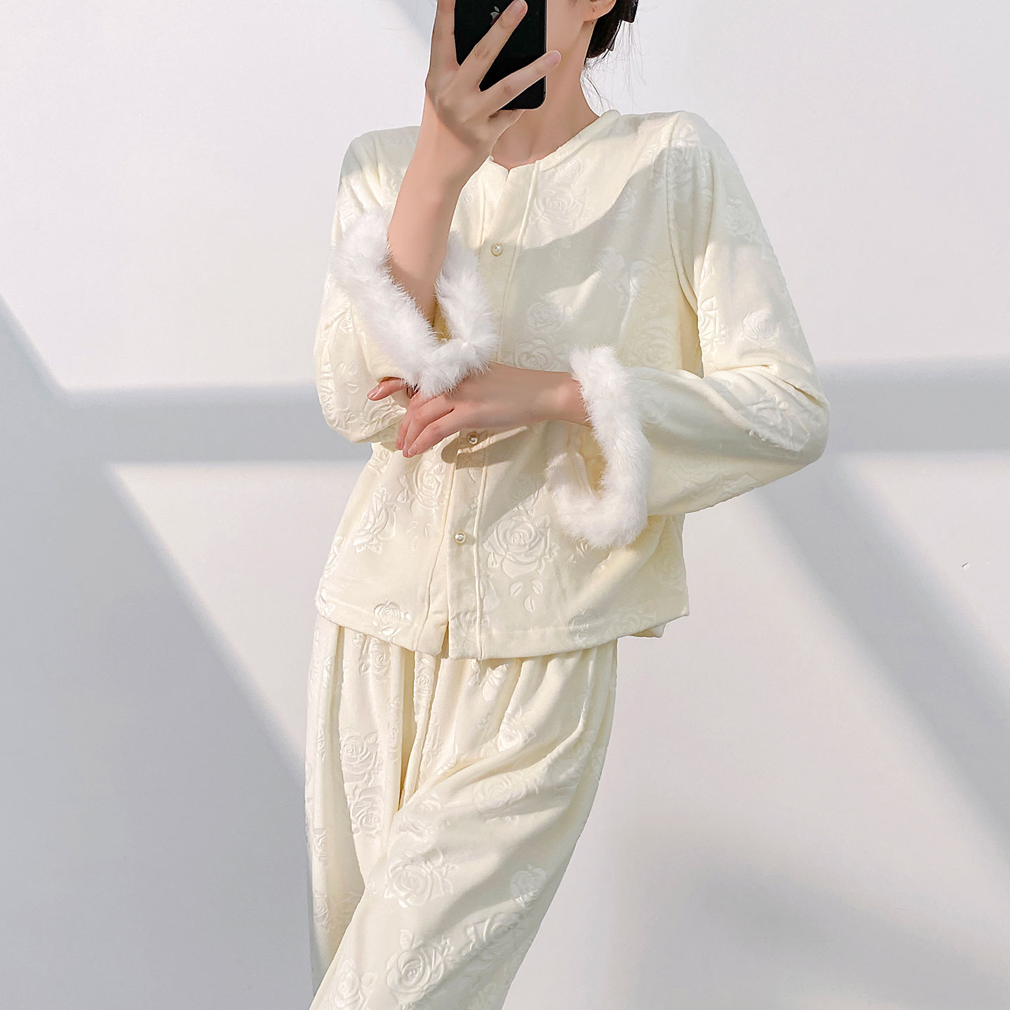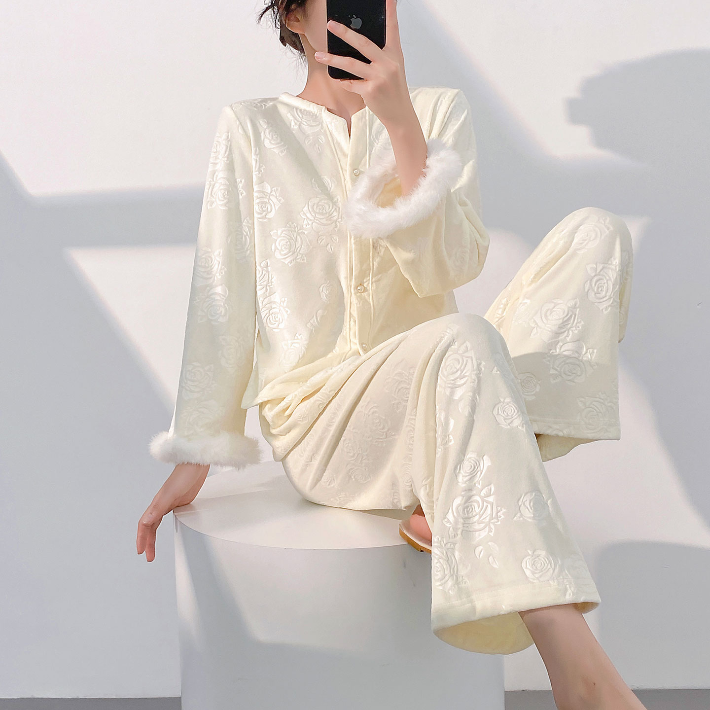 玫瑰压花毛毛袖海岛绒睡衣女秋冬新款显瘦开衫家居服长袖保暖睡衣,北京