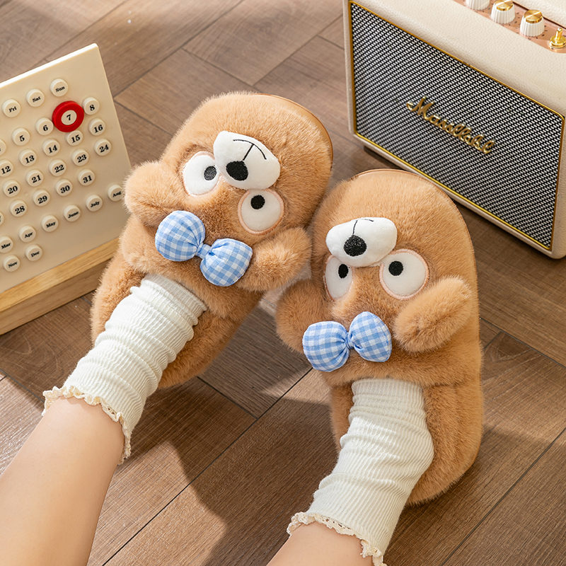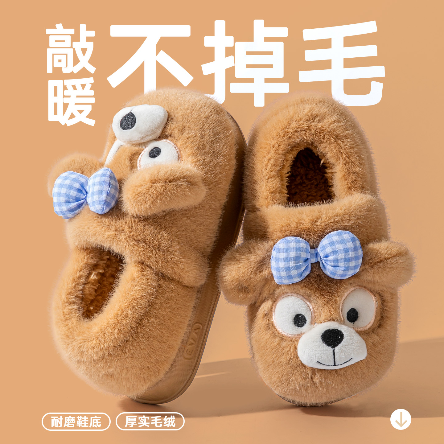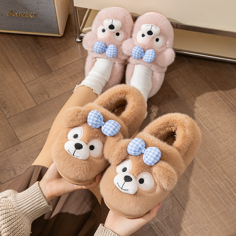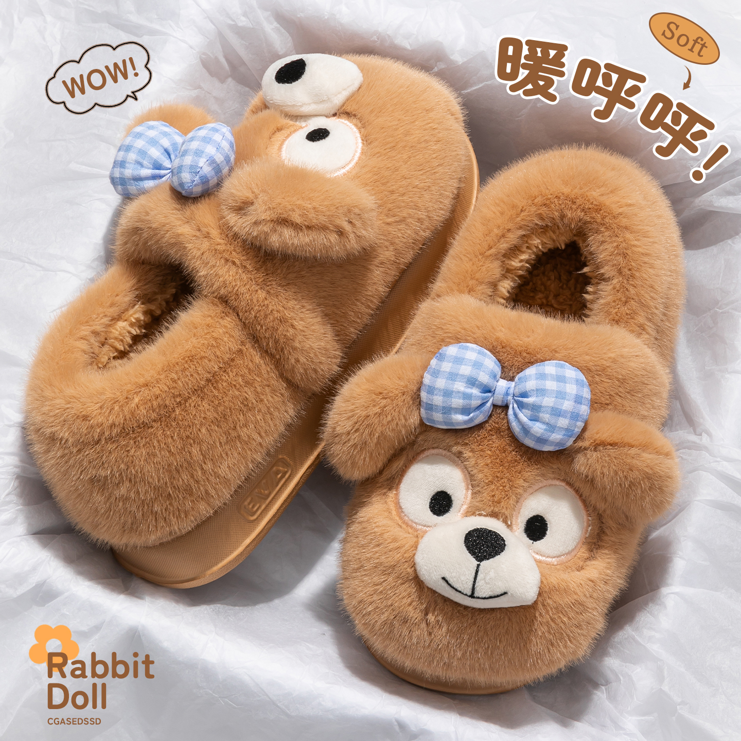 可爱小熊棉拖鞋女款包跟秋冬季居家宿舍厚底防滑外穿保暖毛绒棉鞋,浙江 金华