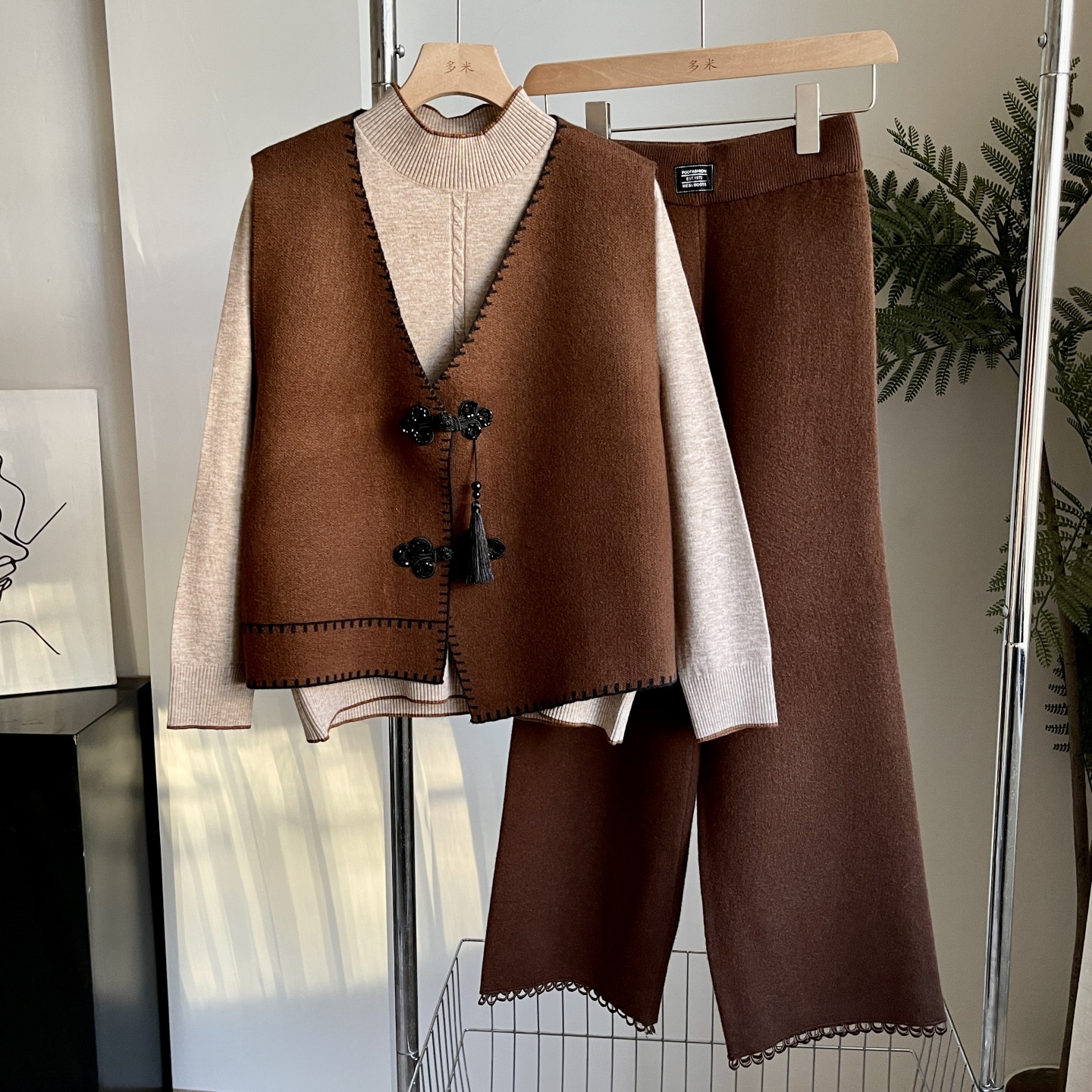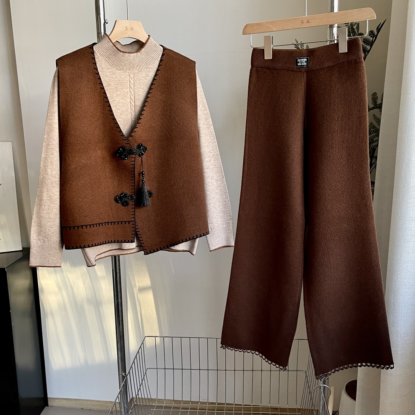 中年妈妈春秋新款新中式马甲三件套中老年女装阔腿裤国风针织套装,浙江 嘉兴