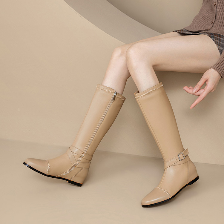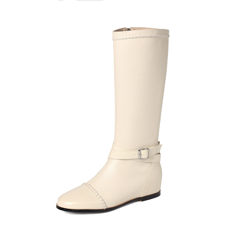 真皮内增高长筒靴女2025秋冬新款圆头女靴百搭单靴米白色骑士靴,四川 成都