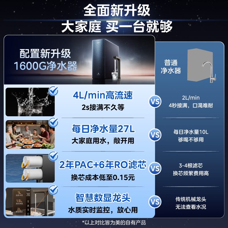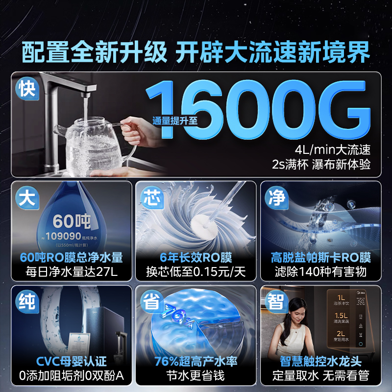【政府补贴】美的家用厨下0阻垢剂净水器RO膜反渗透星河1600pro,广东 佛山