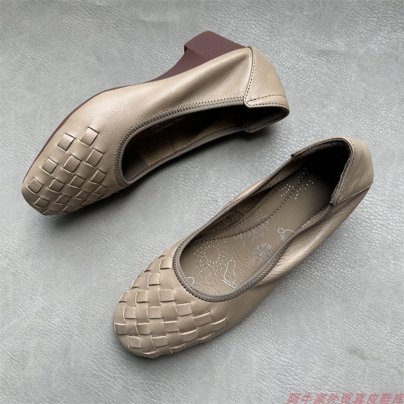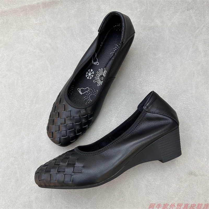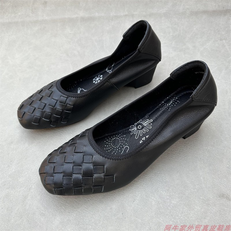外贸真皮女鞋牛皮浅口单鞋2023新款真皮软皮透气百搭粗跟妈妈鞋