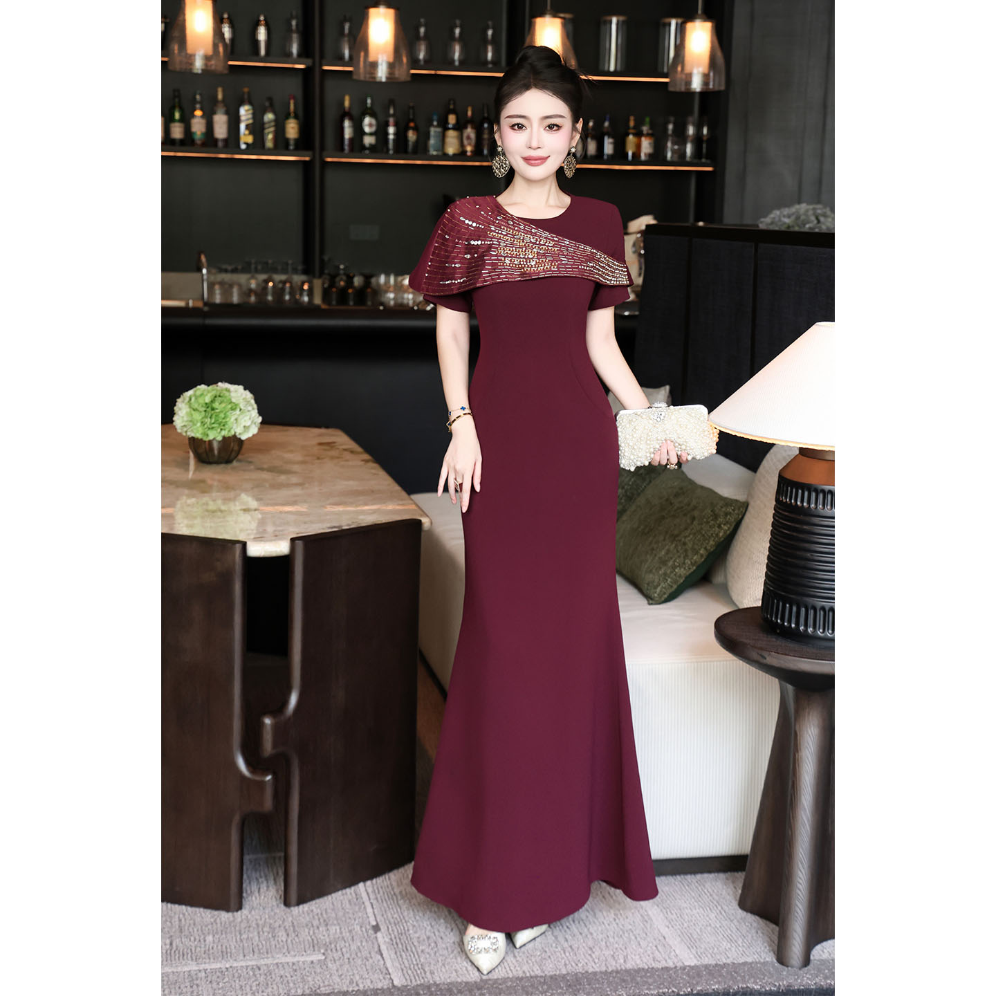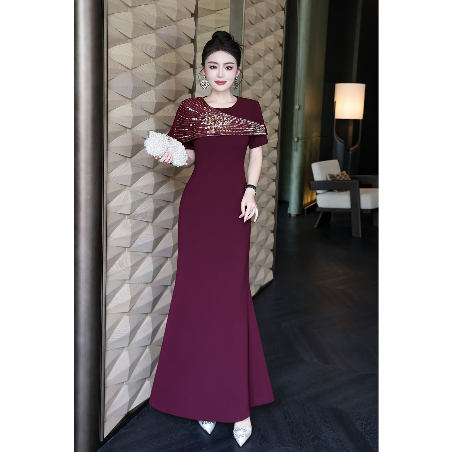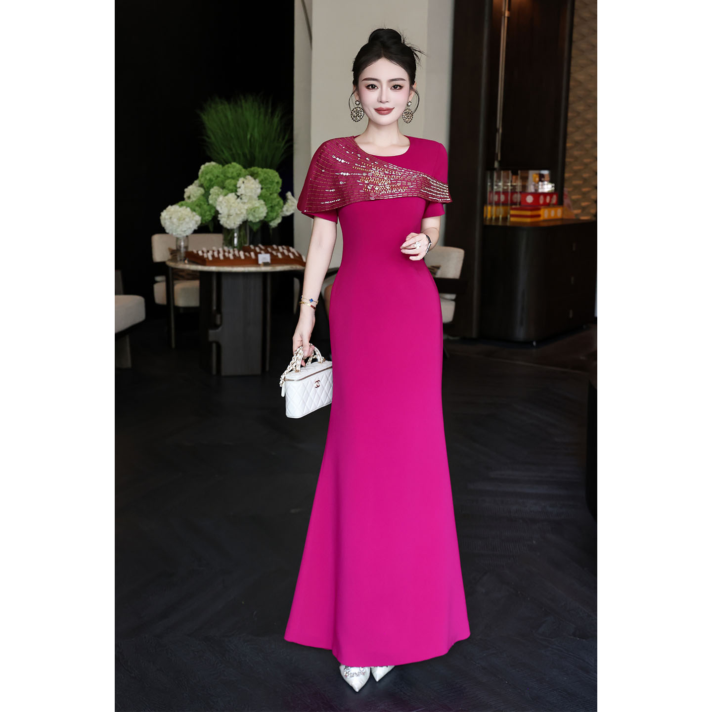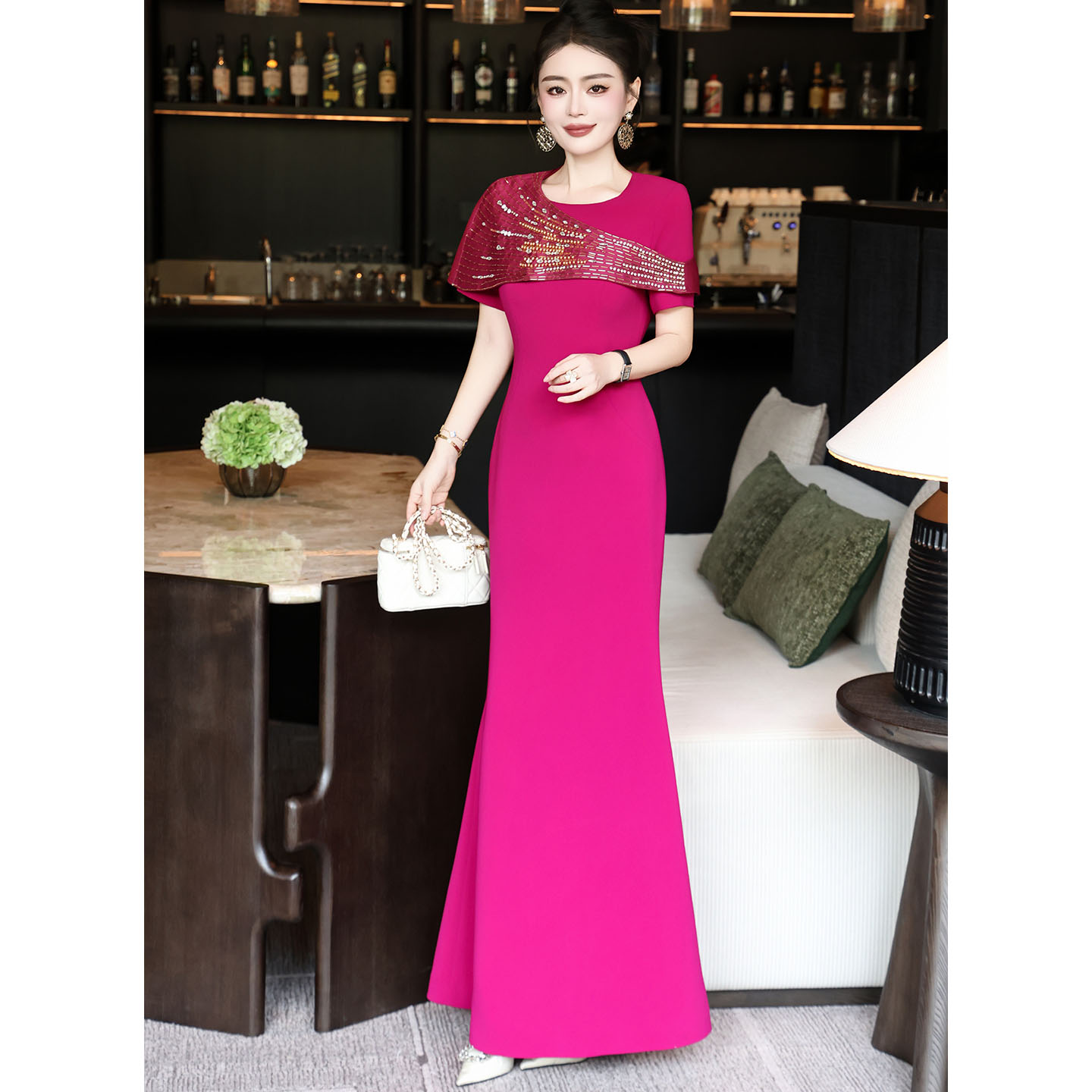 高端亮片订钻短袖长裙女宴会礼服连衣裙2025优雅显瘦气质婚礼晚装,广东 深圳