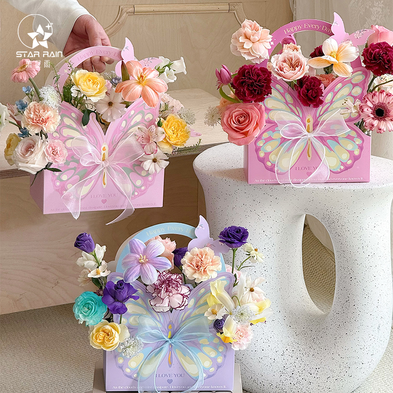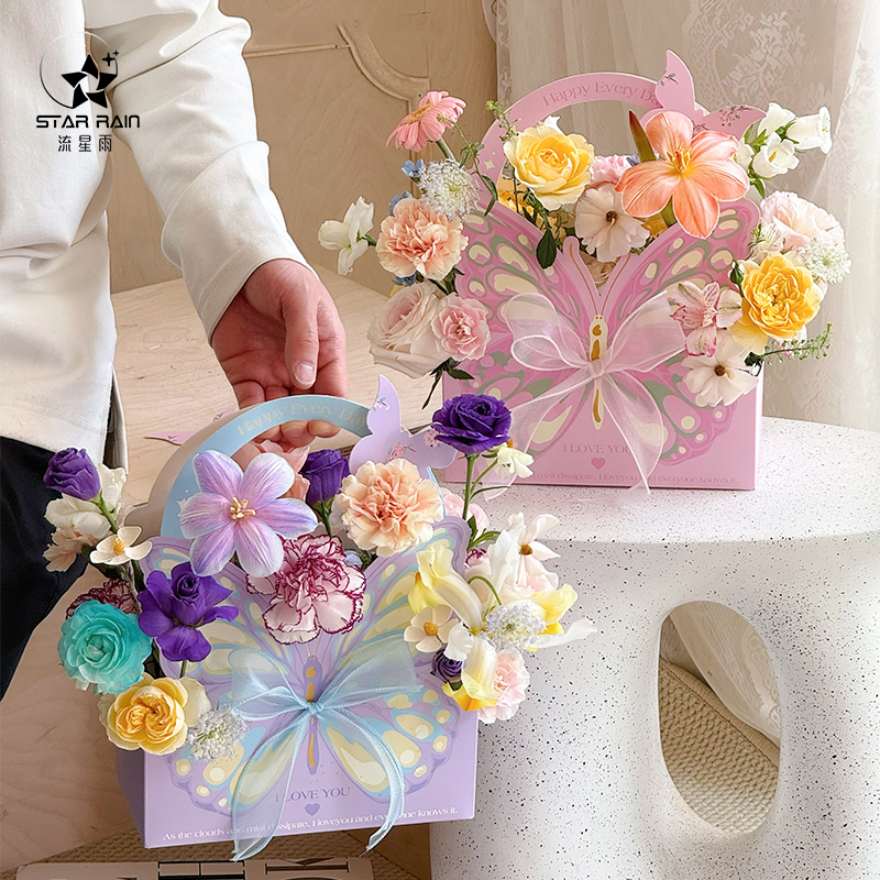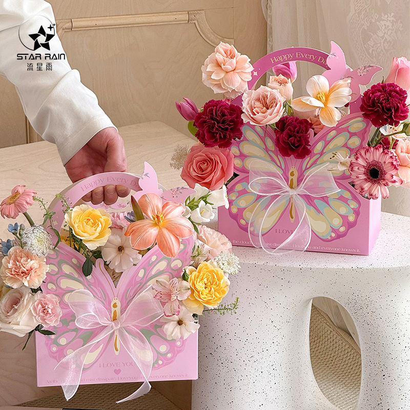 流星雨烫金蝴蝶结手提花盒鲜花包装盒花束插花空盒子花艺材料资材,浙江 金华