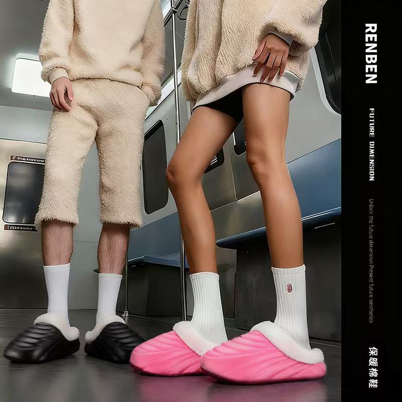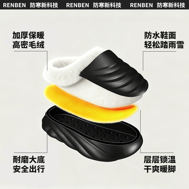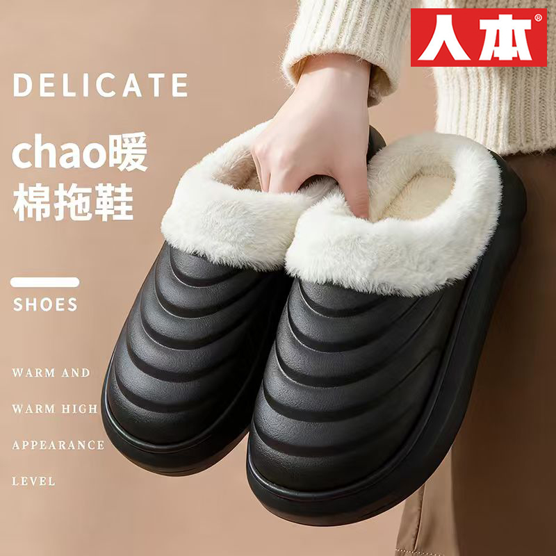 人本居家棉拖鞋女新款冬季加绒厚底防滑防水可外穿保暖包跟棉鞋男,浙江 杭州