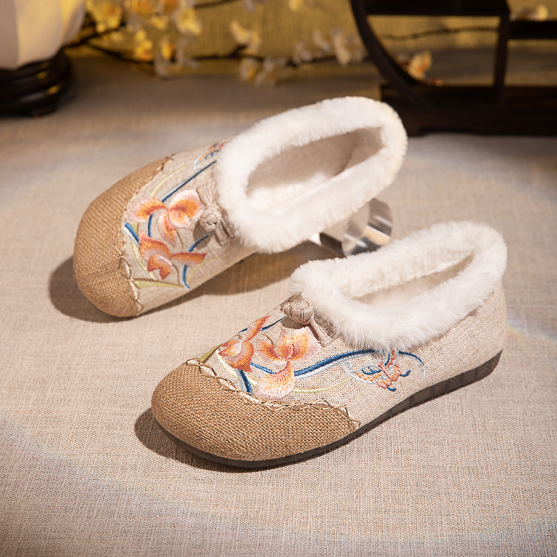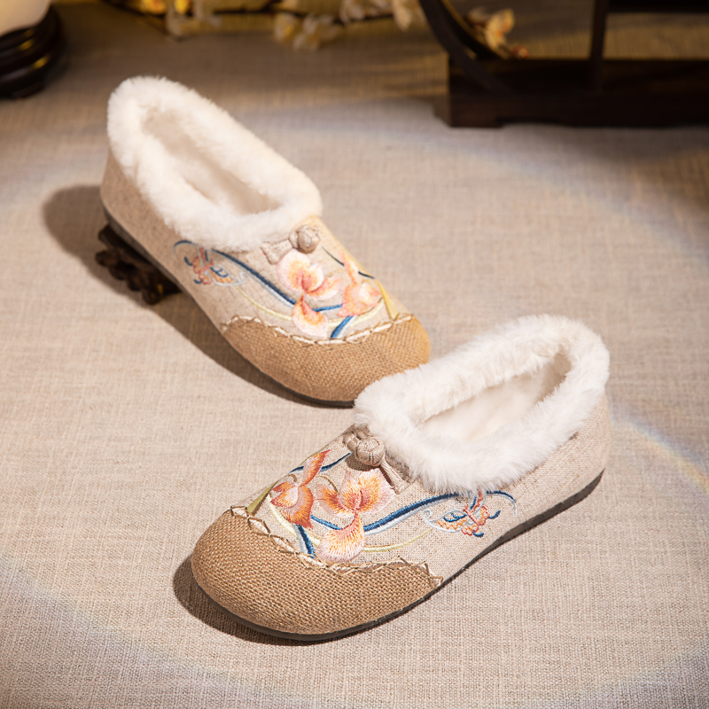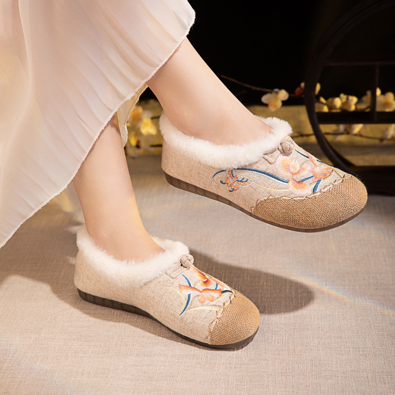 老北京布鞋女冬季2025新款加绒软底懒人一脚蹬妈妈鞋古风绣花棉鞋,湖南 长沙