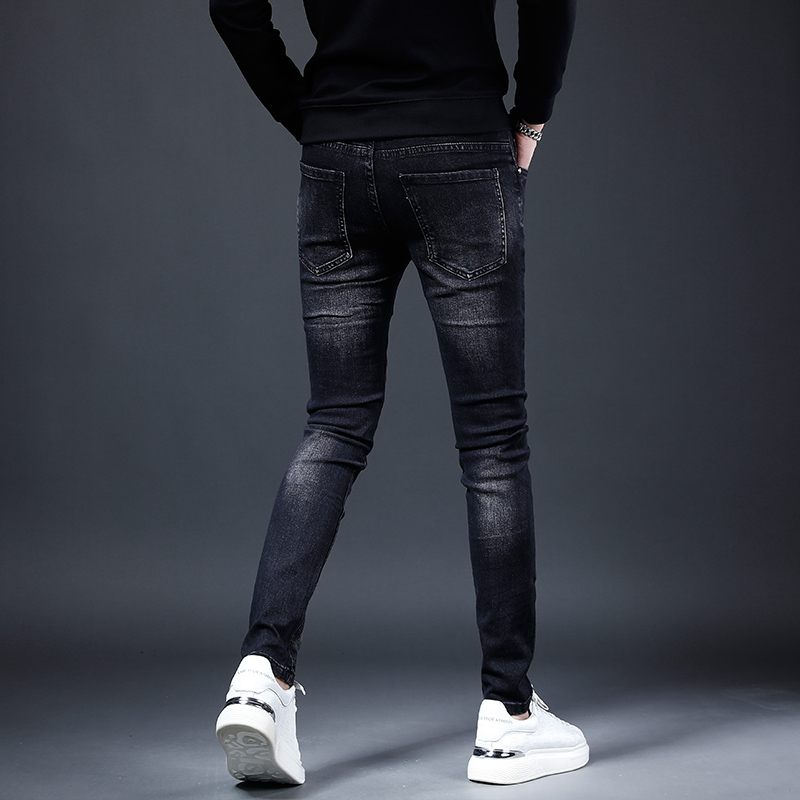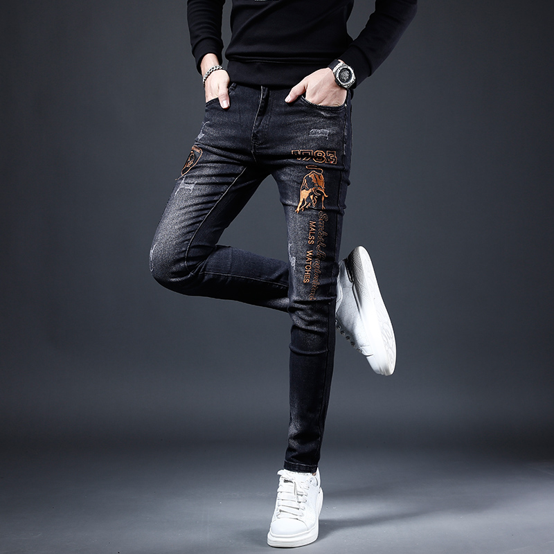 2025秋冬刺绣牛仔裤男潮牌修身小脚裤子弹力休闲黑色男士长裤加绒,广东 广州