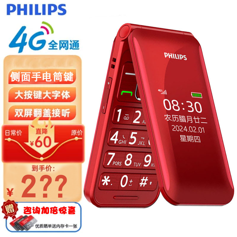Philips/飞利浦 E6615翻盖手机老年机4G+全网通中老人机联通电信,广东 深圳
