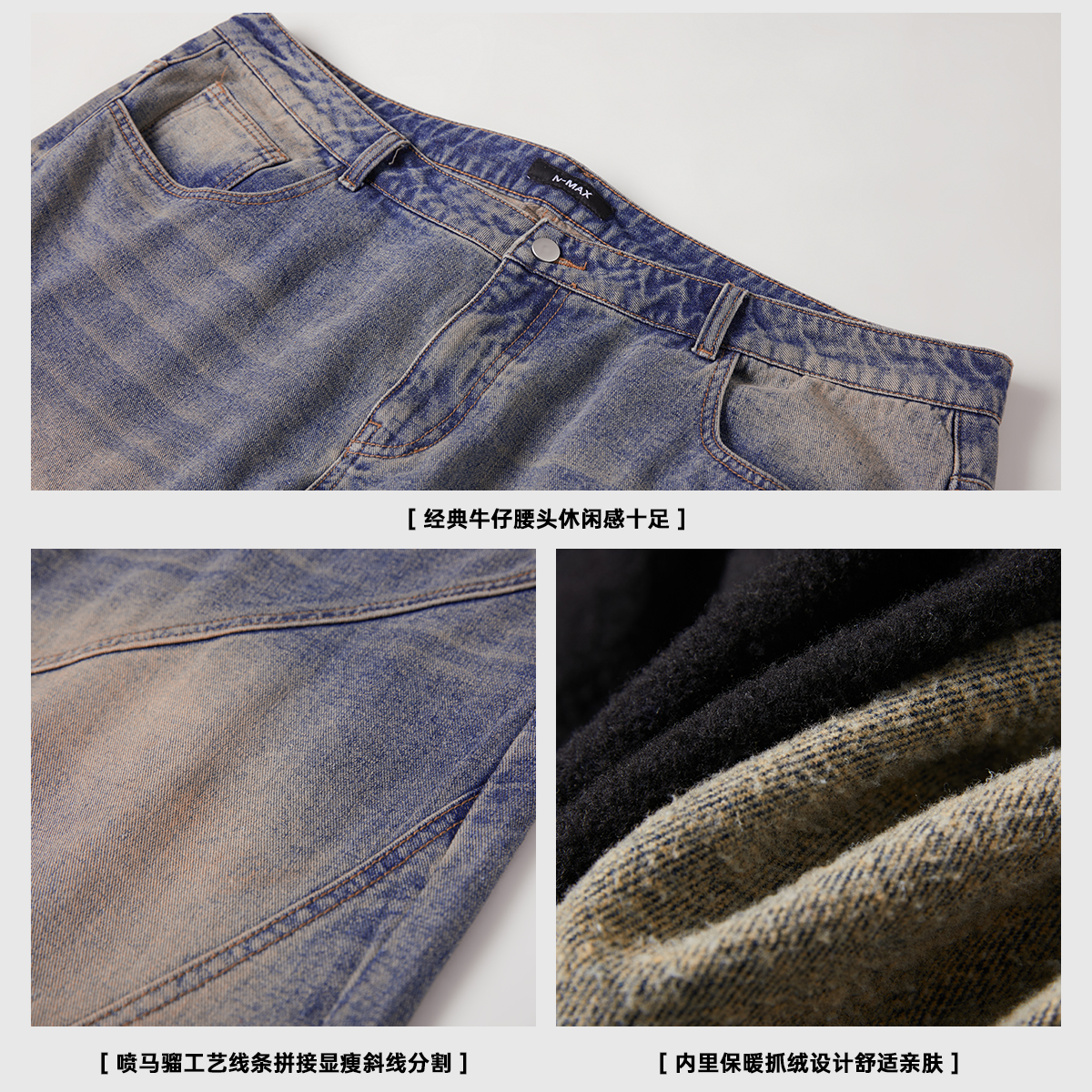 NMAX大码潮牌男装冬季抓绒保暖牛仔裤喷马骝水洗分割直筒裤