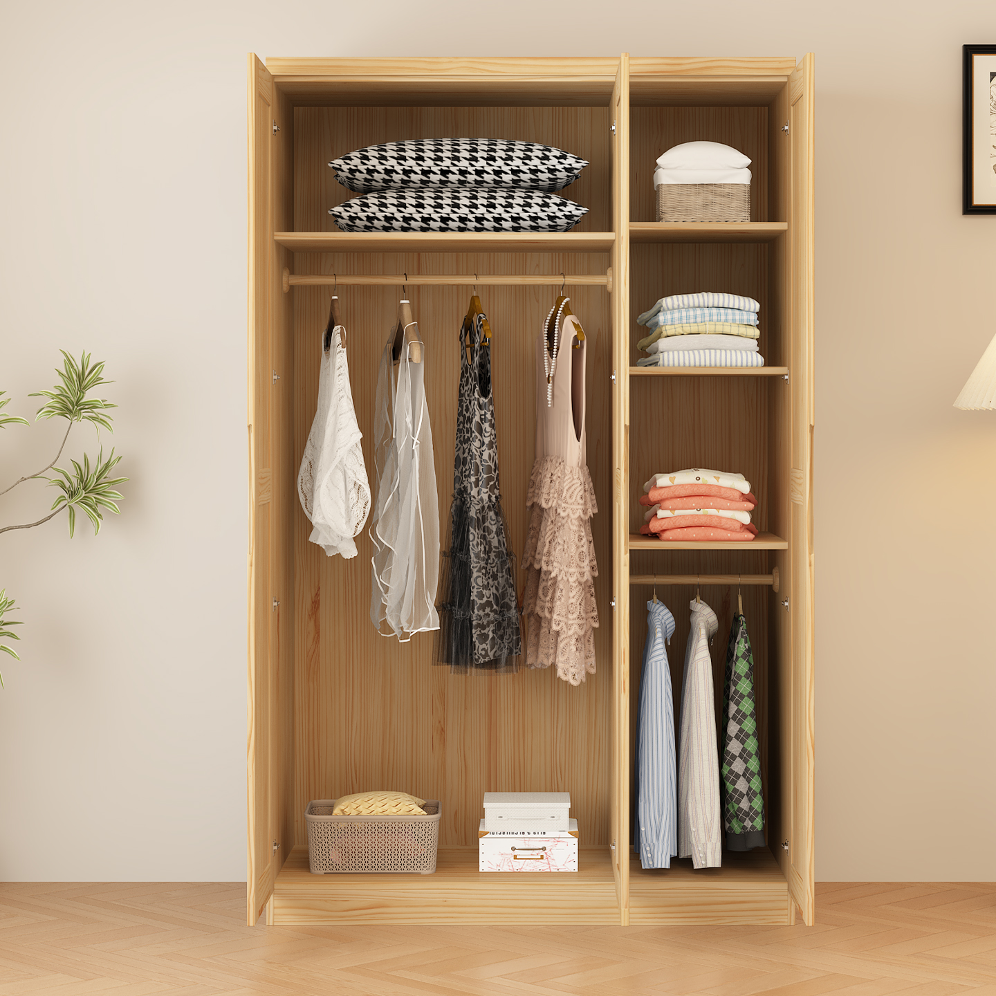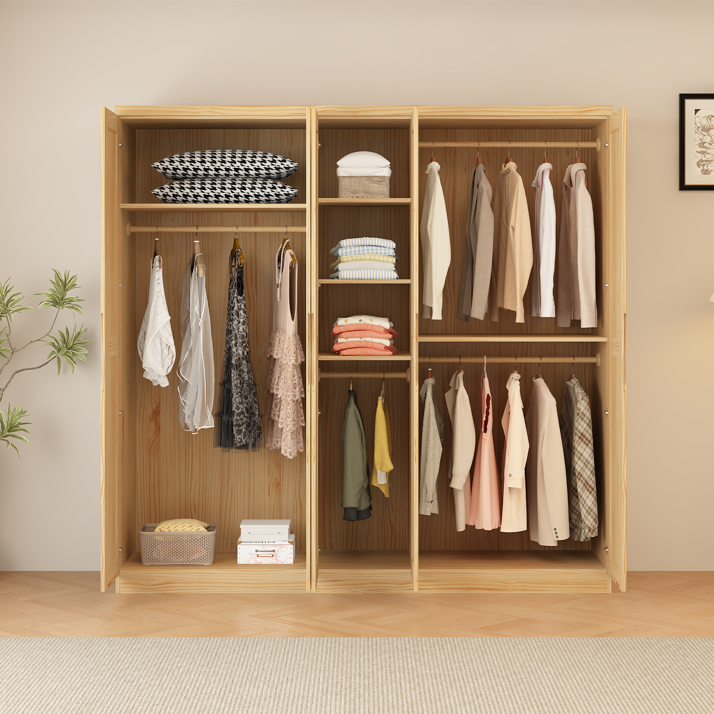 全实木衣柜松木平开门卧室加高2米3四五六门衣橱家用成人儿童收纳,广东 揭阳