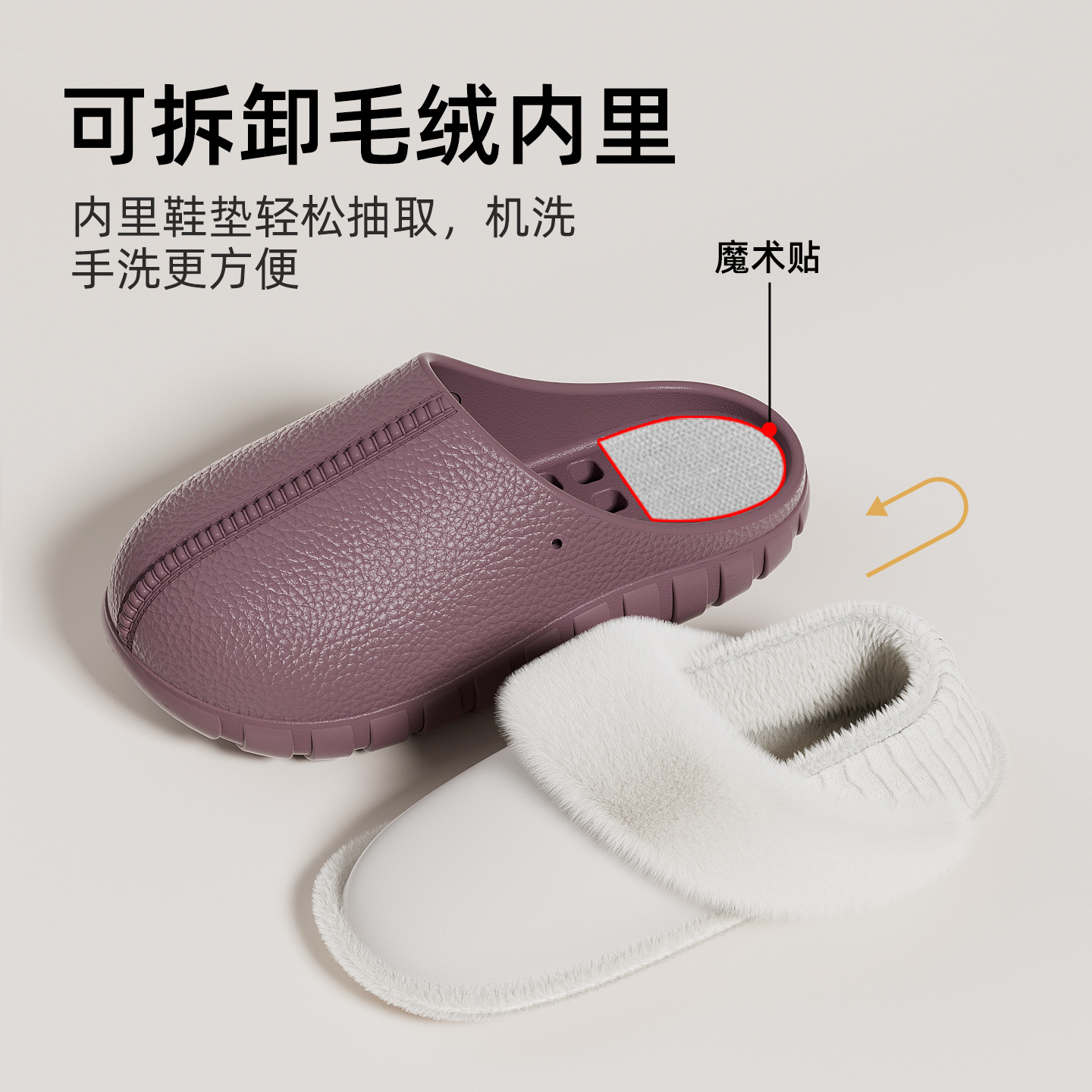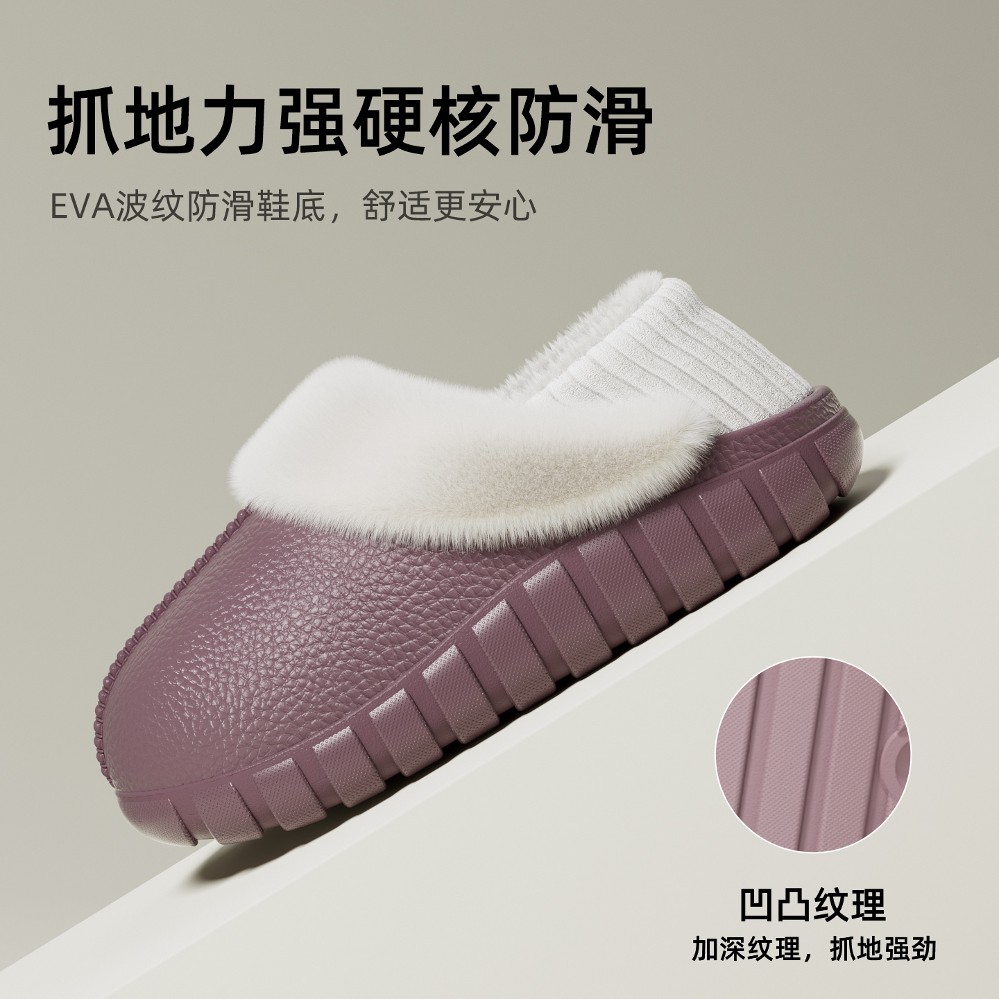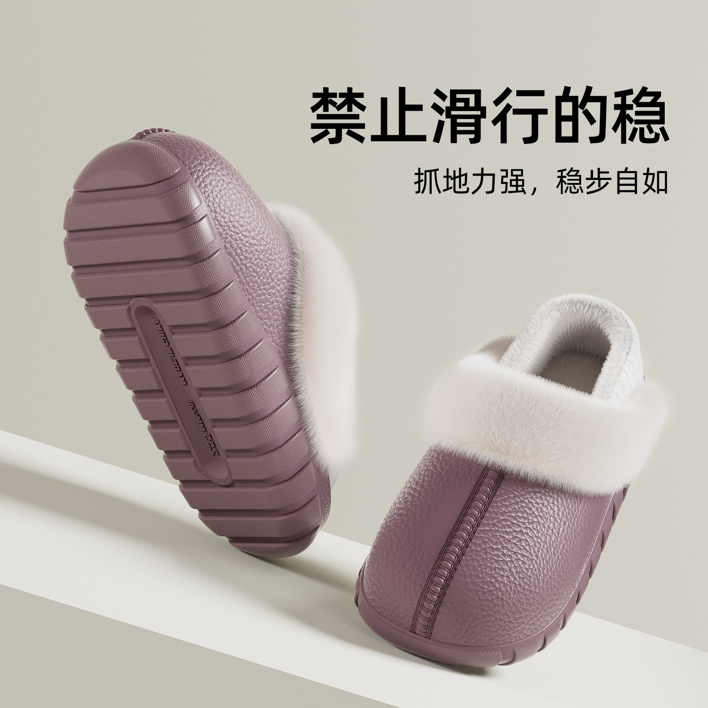 防水皮纹棉拖鞋男女冬季厚底居家防滑保暖可拆洗毛绒室内包跟棉鞋,福建 福州