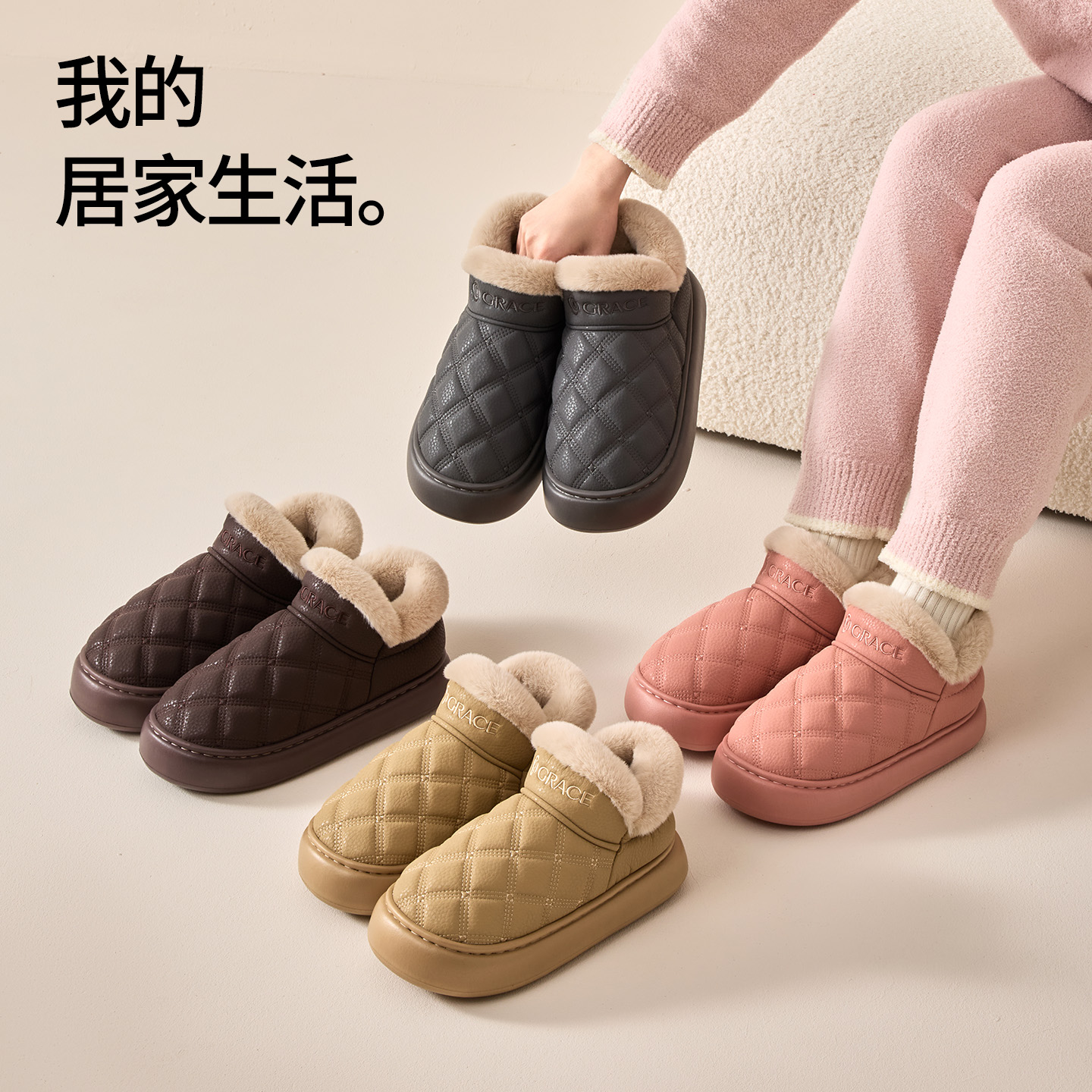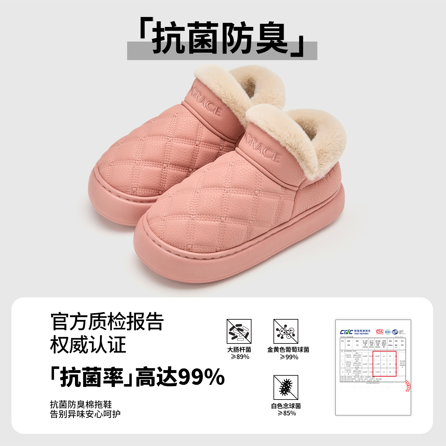 洁丽雅防水棉拖鞋女款冬季居家防滑加厚保暖皮面毛绒棉鞋男士后跟,浙江 杭州