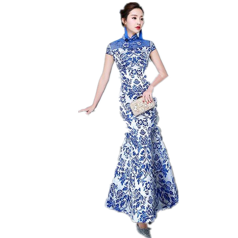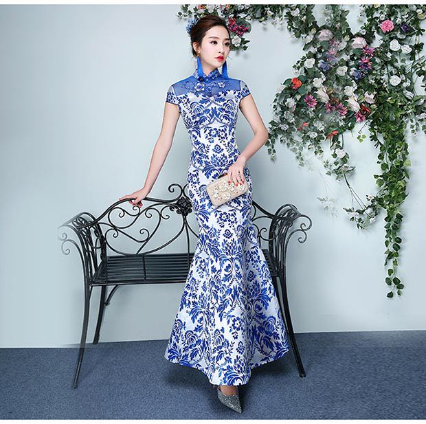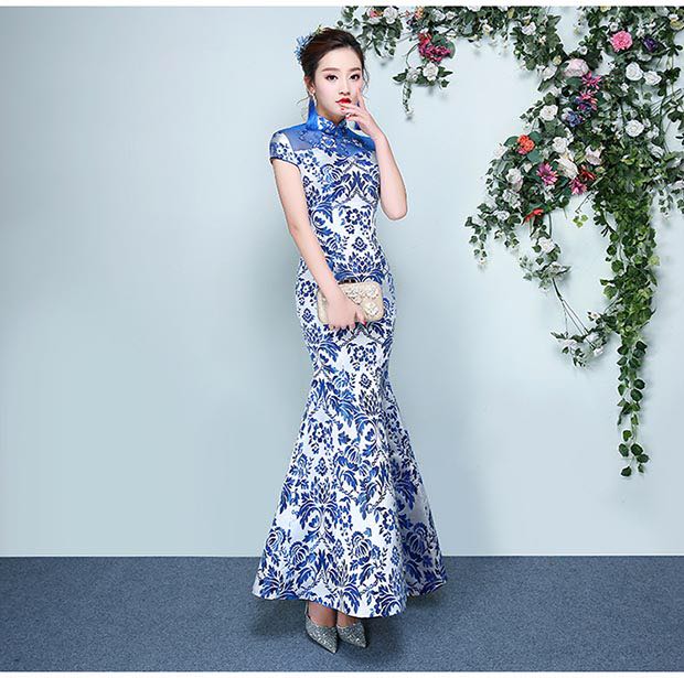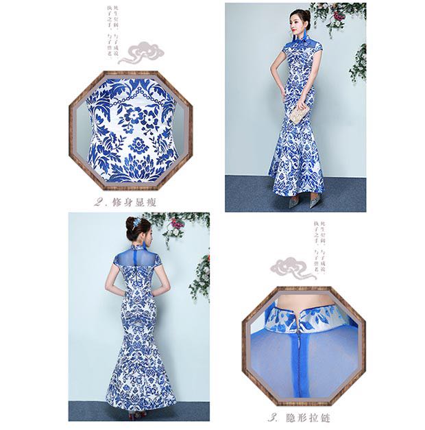 新款青花瓷旗袍鱼尾晚礼服长款性感修身中式主持宴会晚装演出服女,江苏 苏州