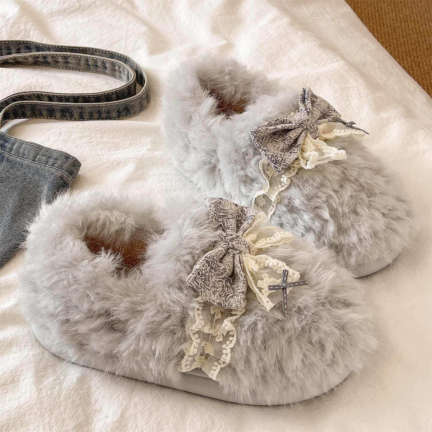 冬季棉拖鞋女款室内居家防滑厚底可爱蝴蝶结包跟外穿毛绒保暖棉鞋,浙江 宁波
