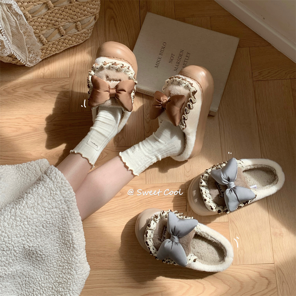 细细条 洛丽塔蝴蝶结棉拖鞋女冬新款网红甜美可爱软厚底居家棉鞋