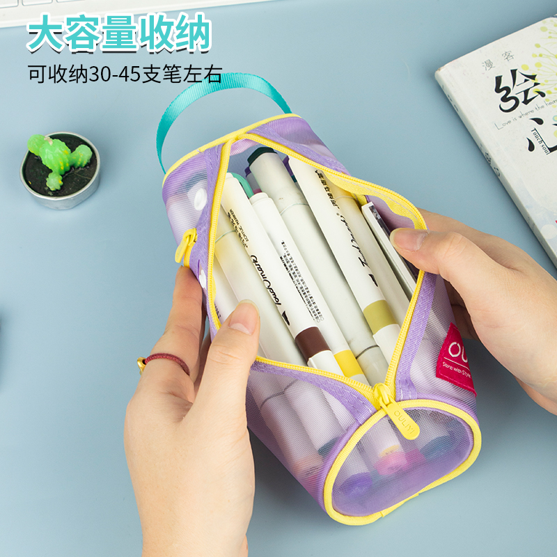 2025新款简约网纱笔袋多巴胺立式笔筒高颜值学生专用大容量文具盒化妆刷收纳袋纵横双用拉链式手提透明网眼袋