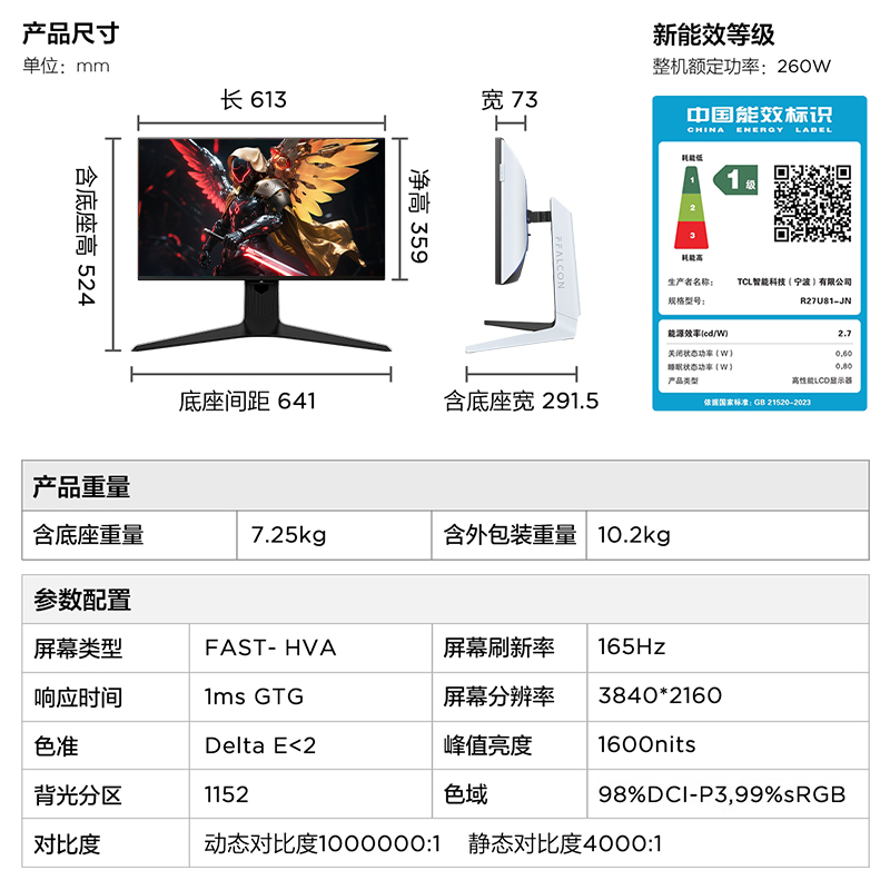 TCL雷鸟U8 27英寸4K165HzDC调光护眼HDR1400 QDMiniLED电竞显示器,广东 惠州