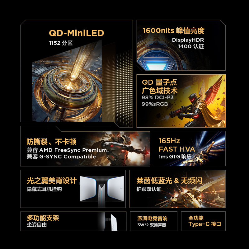 TCL雷鸟U8 27英寸4K165HzDC调光护眼HDR1400 QDMiniLED电竞显示器