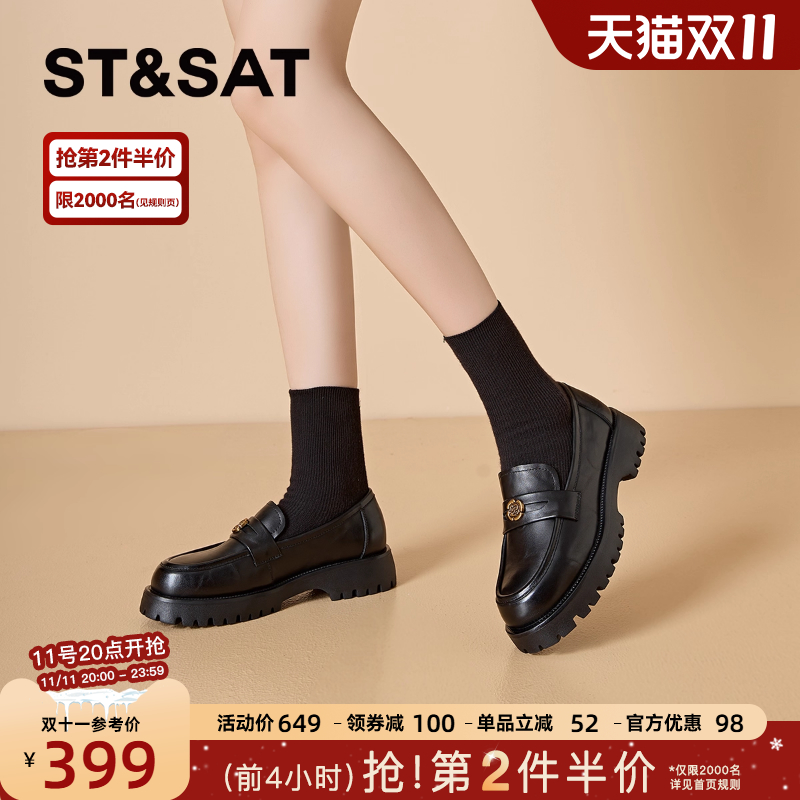 星期六真皮乐福鞋女山茶花新款秋季女鞋平底单鞋英伦风黑色小皮鞋