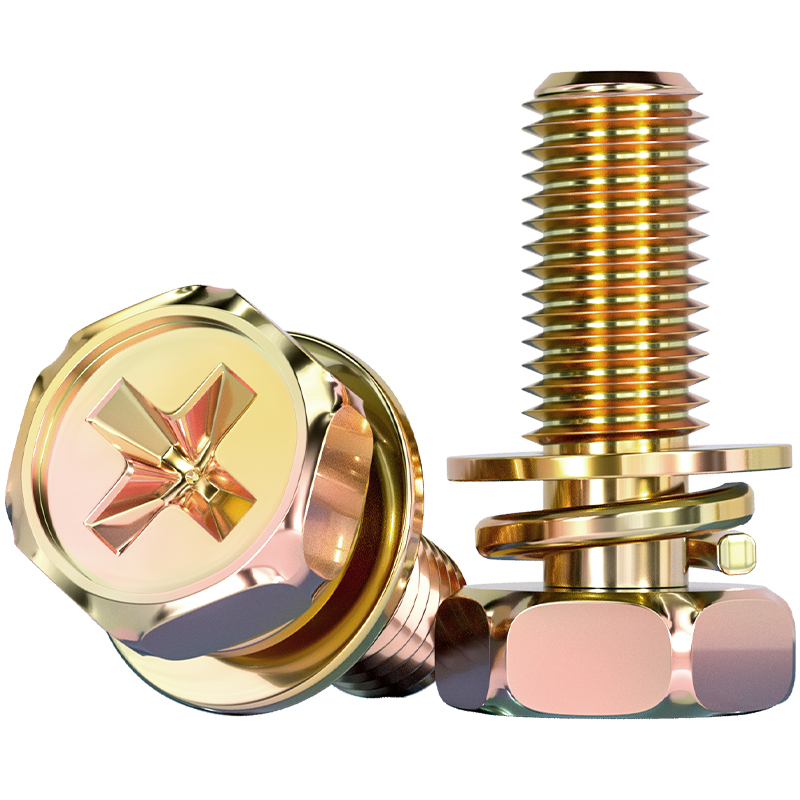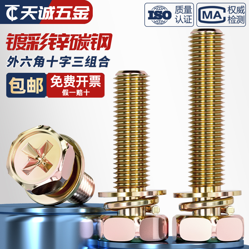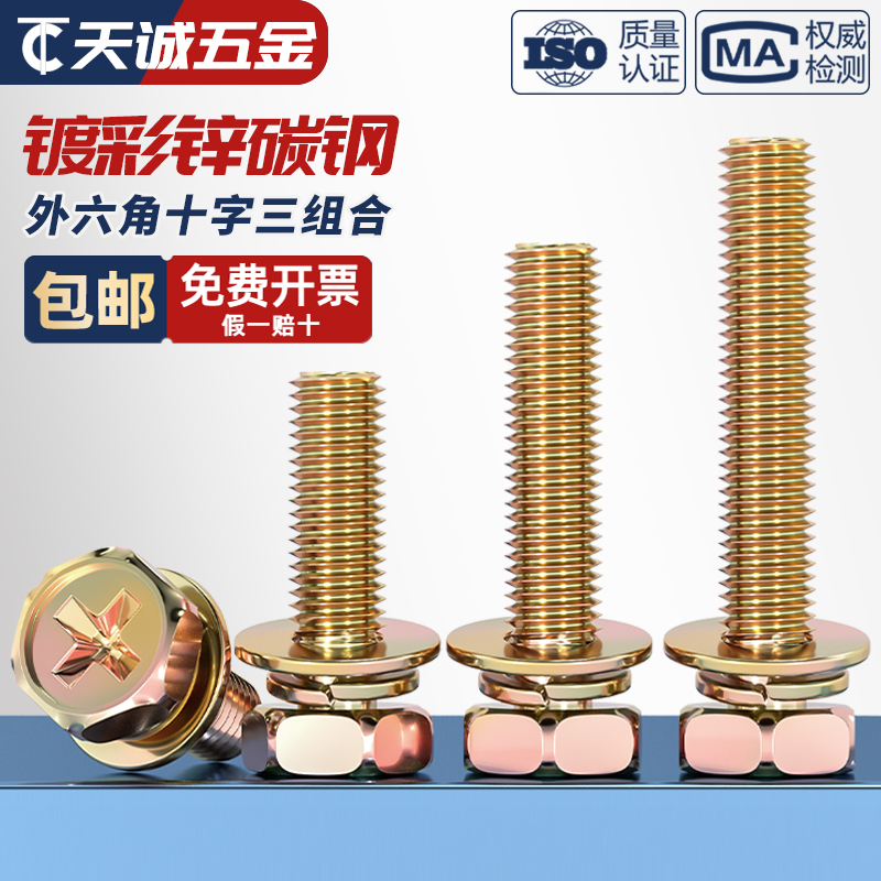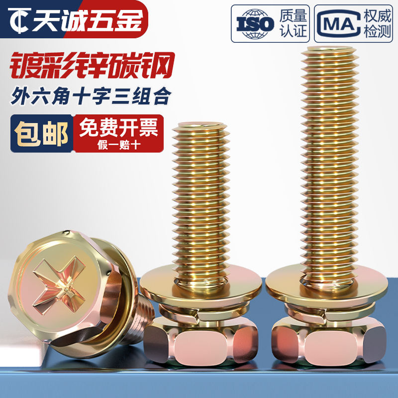 镀彩锌外六角十字三组合螺丝钉凹穴平弹垫片组合螺栓MM4M5M6M8M10,江苏 苏州