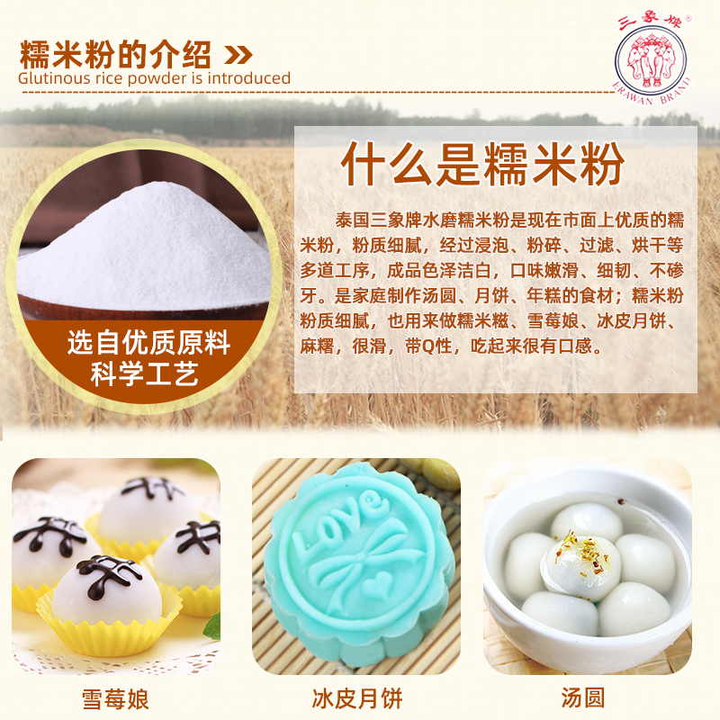 泰国三象水磨糯米粉家用汤圆青团麻球材料雪媚娘冰皮月饼烘焙专用,江苏 无锡