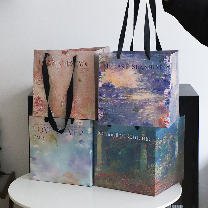 花喜爱新款花束手提袋油画风抱抱袋手提插花袋礼物鲜花包装材料