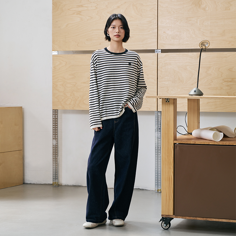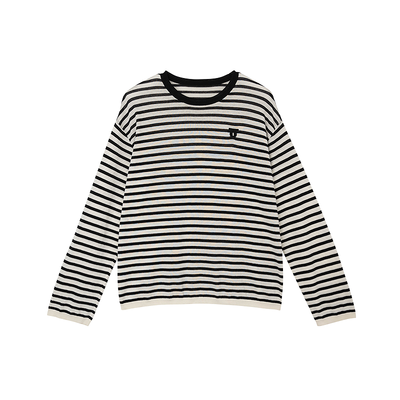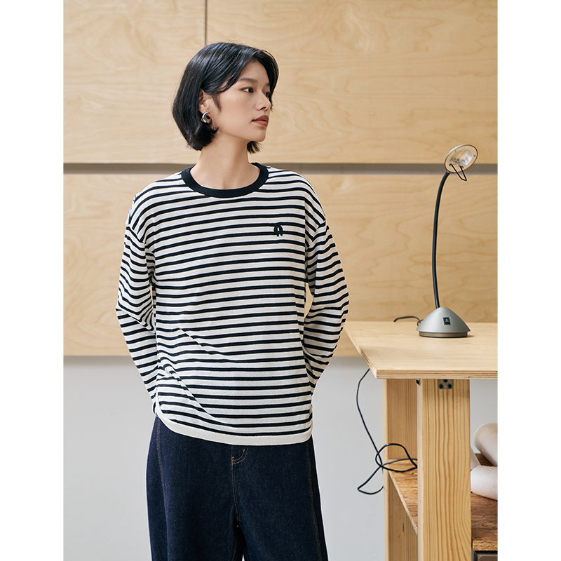 【棉麻针织】OTT2025冬季女装新品经典黑白条纹圆领毛织套头衫T恤,浙江 湖州
