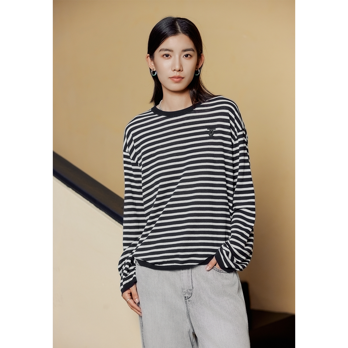 【棉麻针织】OTT2025冬季女装新品经典黑白条纹圆领毛织套头衫T恤