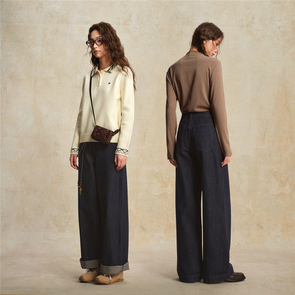 [卢正义明星款]佐丹奴秋冬新款慵懒高腰阔腿原色牛仔裤女18415914