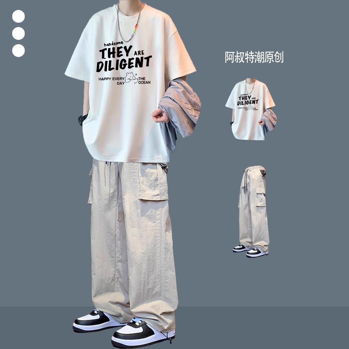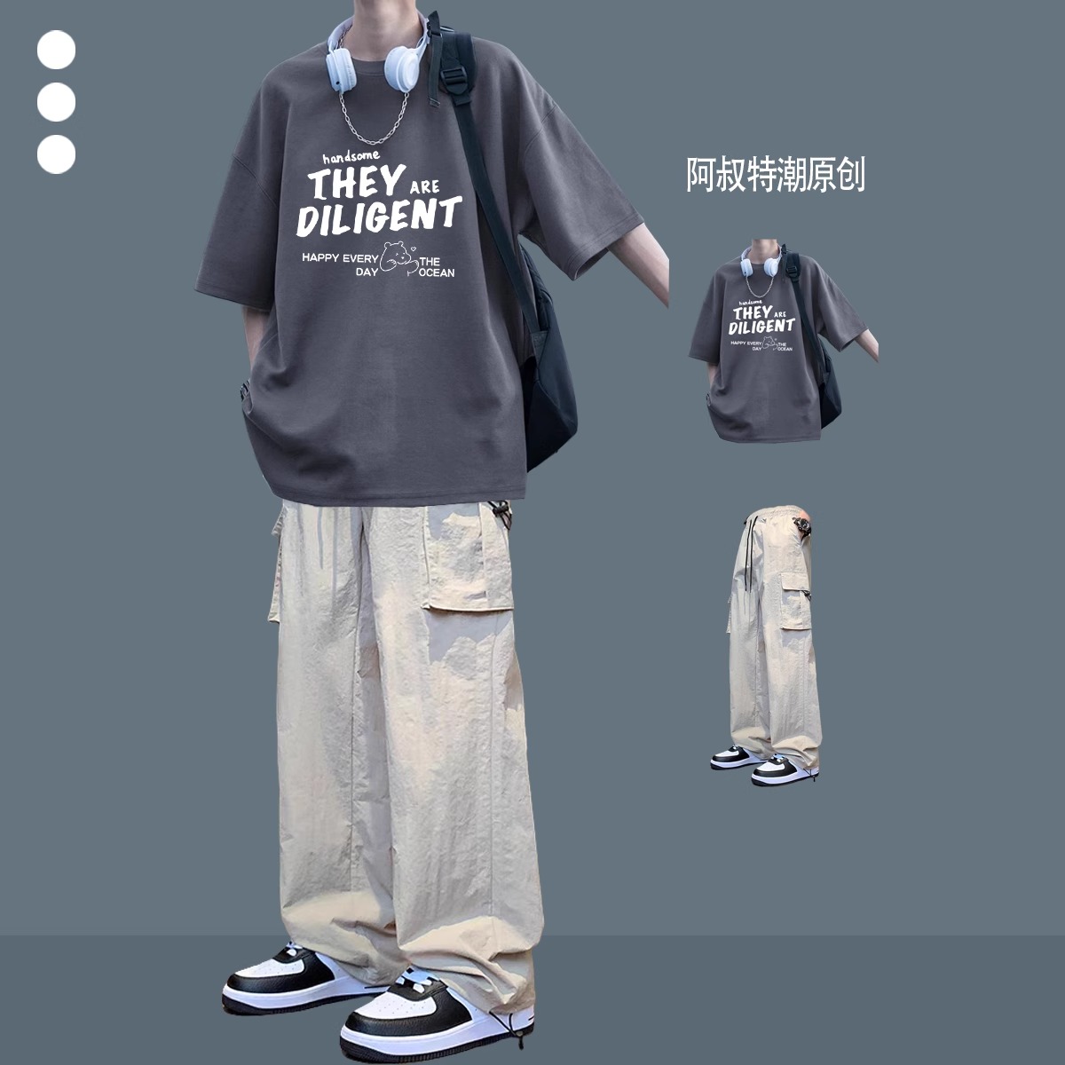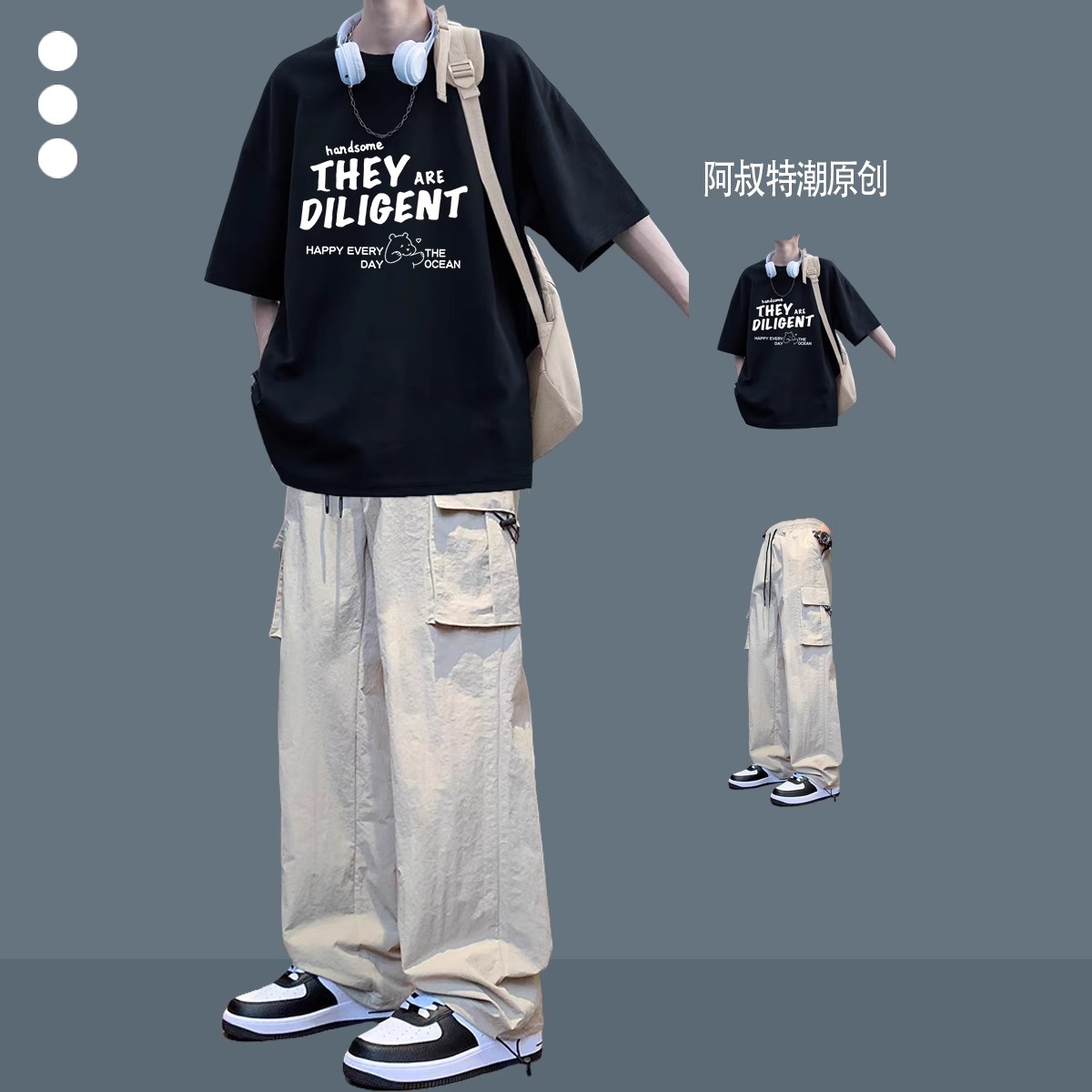夏季纯棉短袖t恤男青少年学生休闲运动套装宽松男装一套搭配帅气