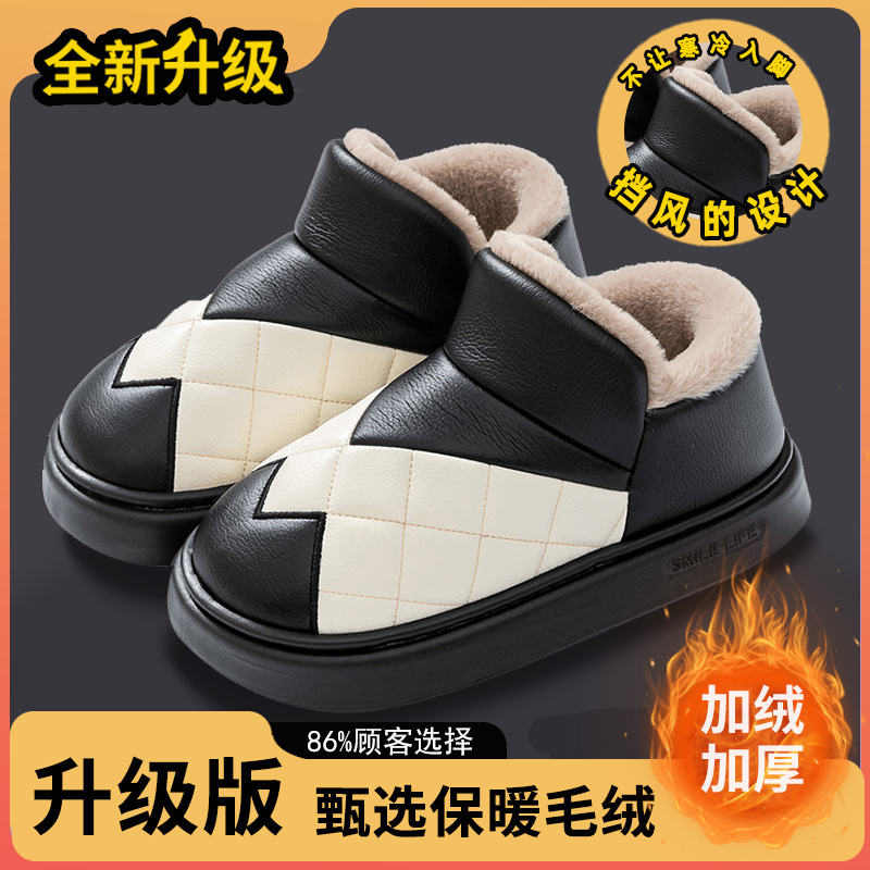 男士棉拖鞋冬天包跟保暖加绒厚底居家室内外穿防滑PU皮防水棉鞋男