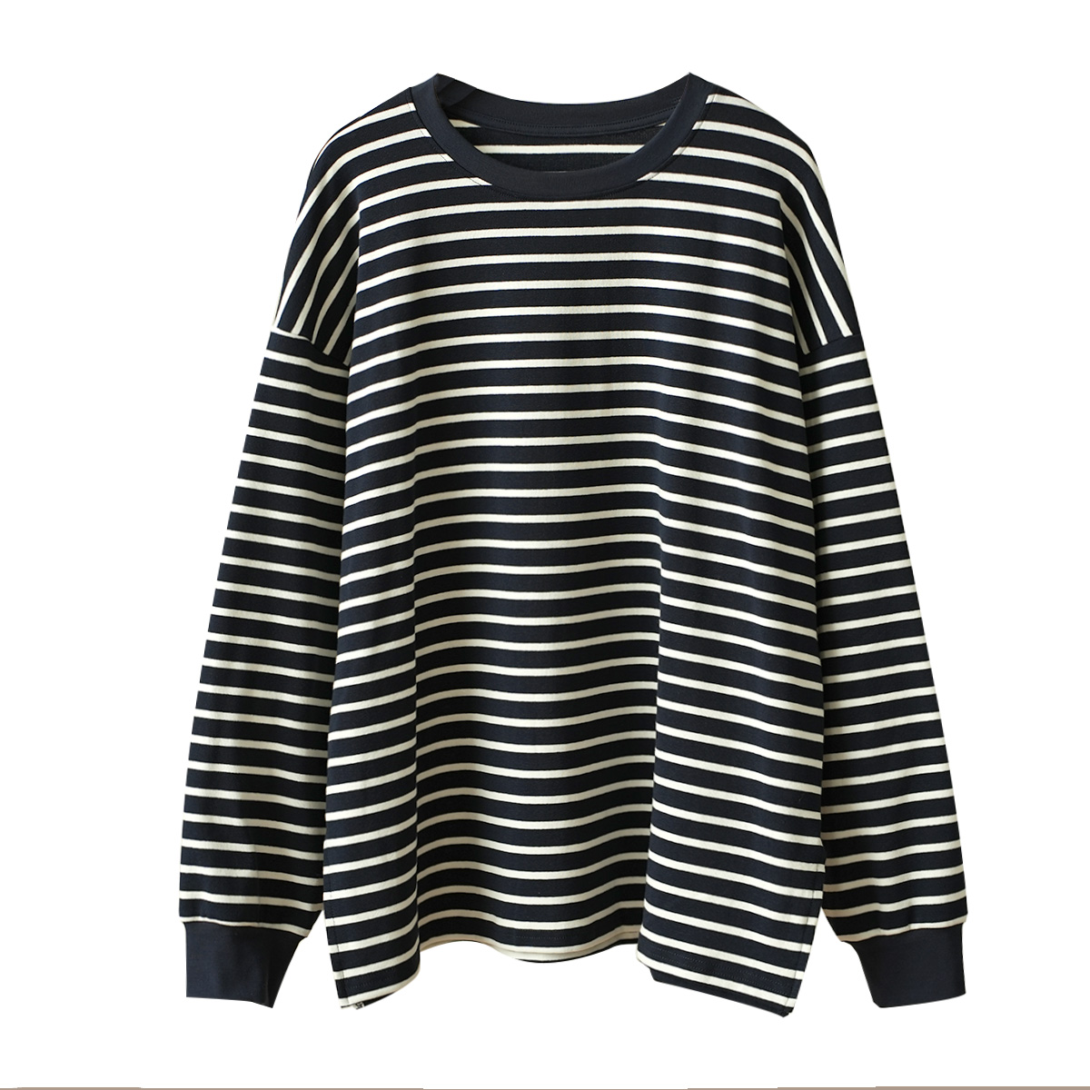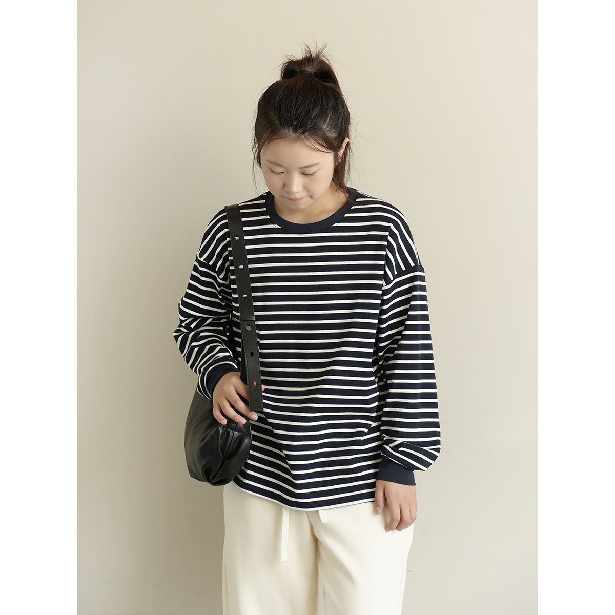 海魂条纹长袖衫 女士纯棉色织圆领T恤 宽松减龄套头衫春款 女装