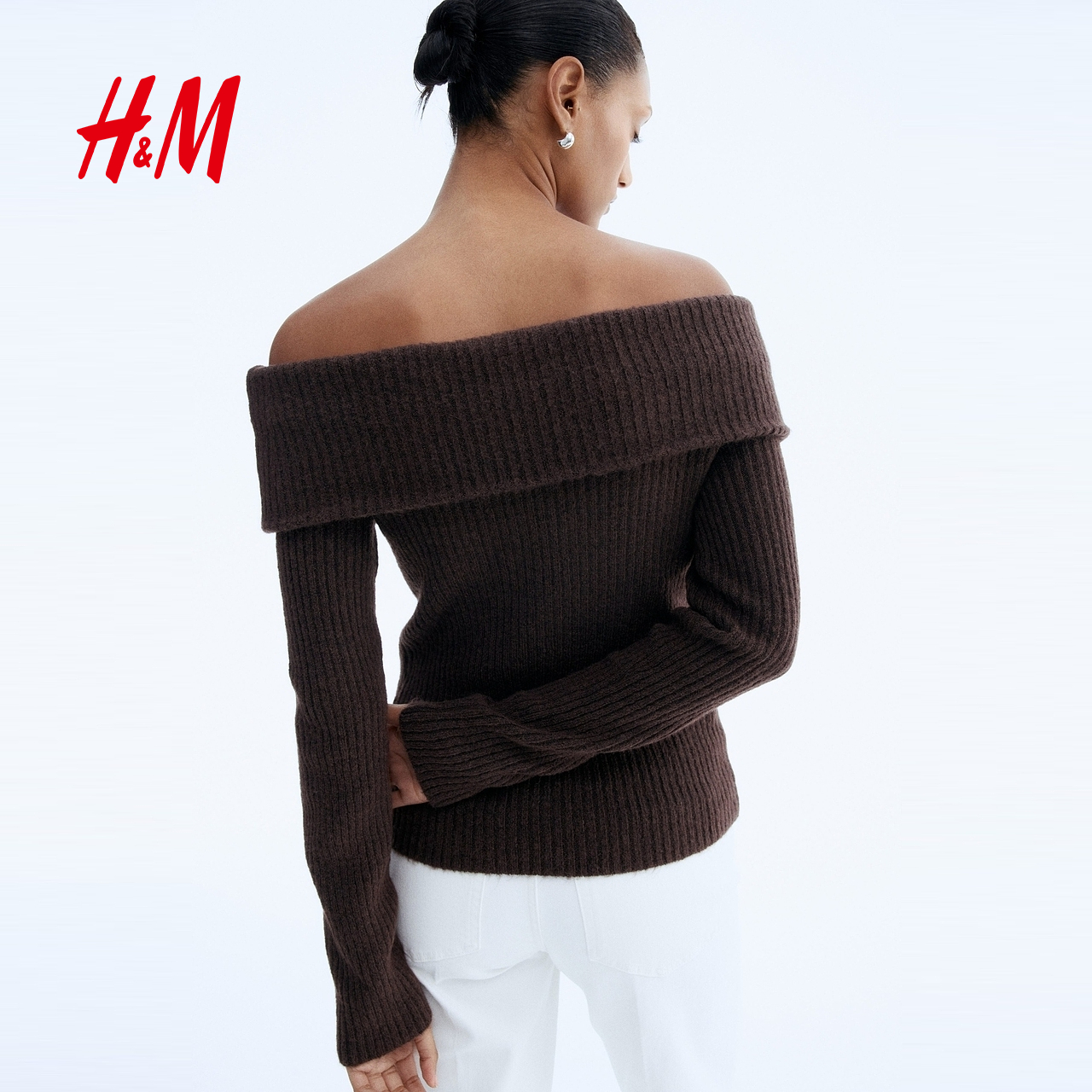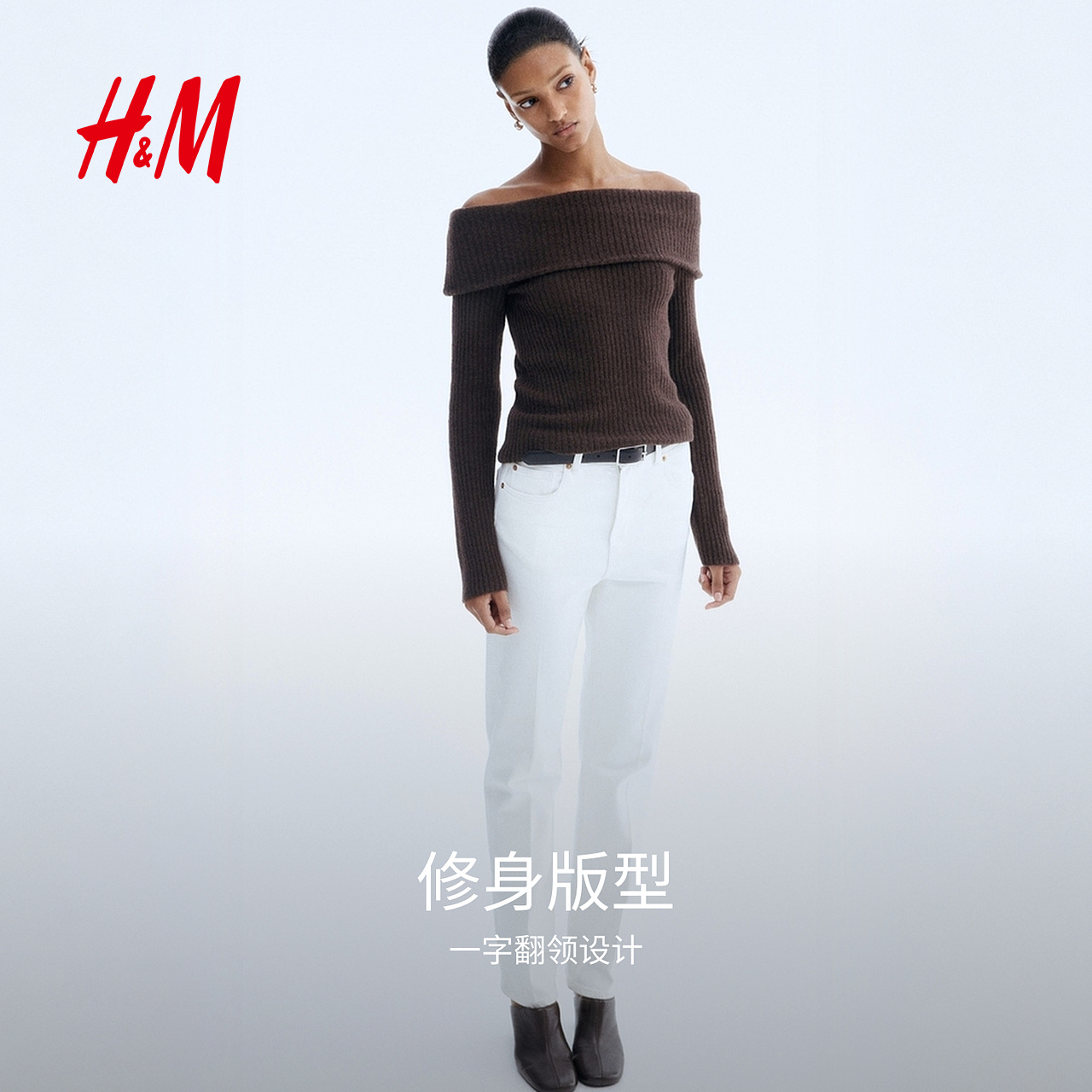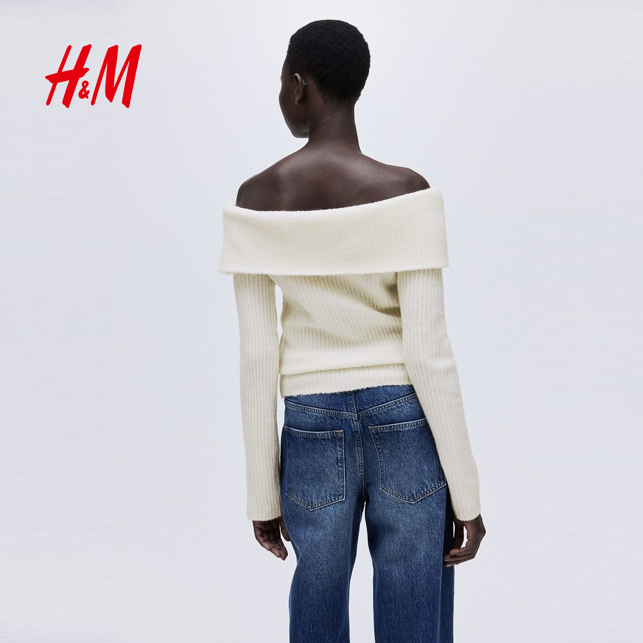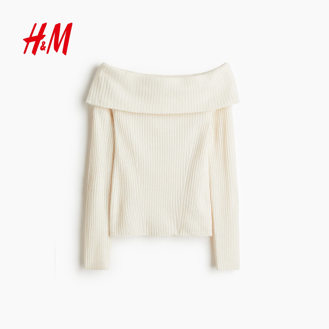 HM女装毛针织衫2025年秋季新款罗纹一字肩保暖休闲上衣1293121,江苏 苏州