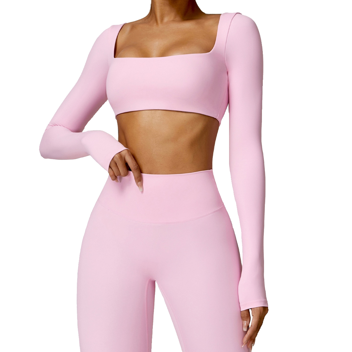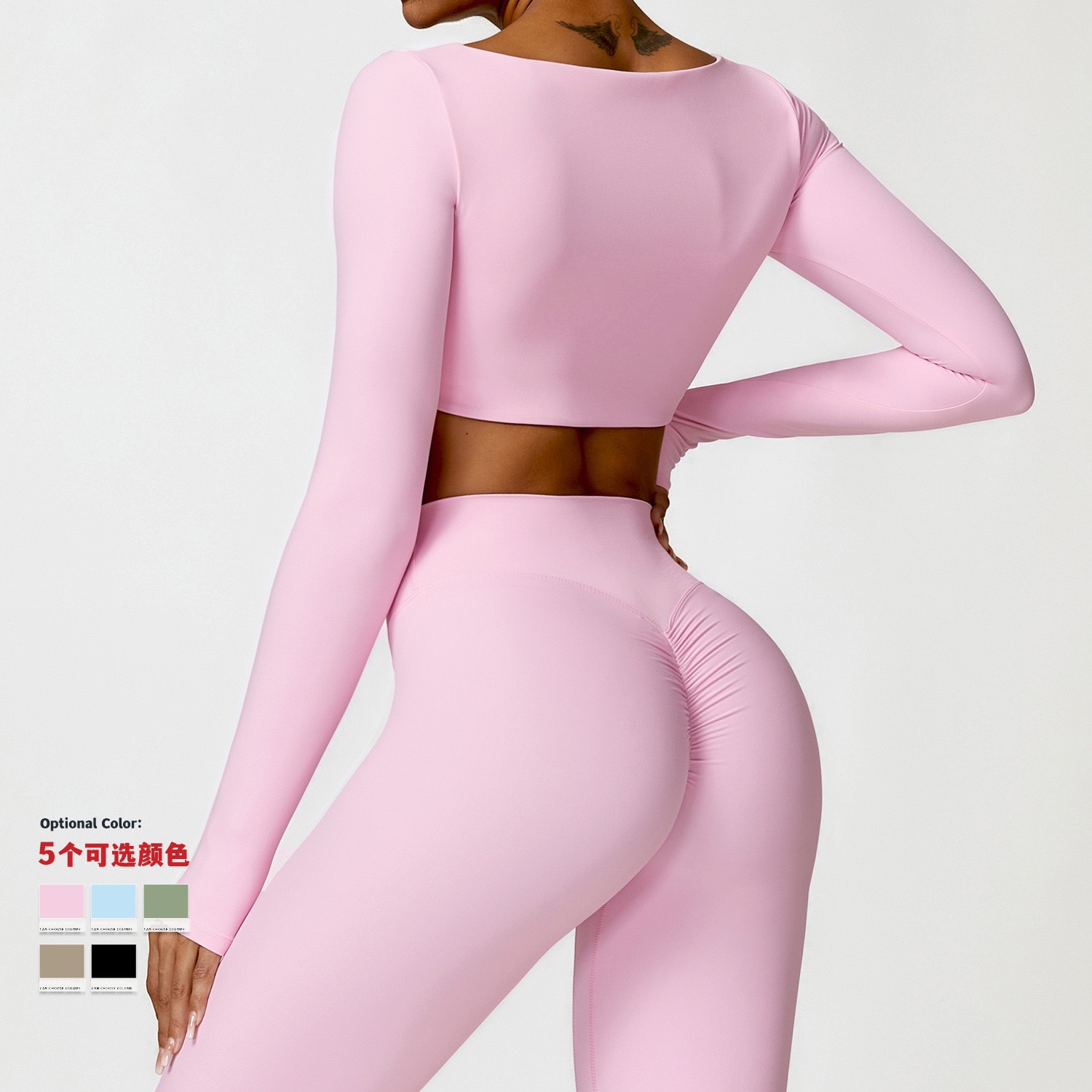 秋冬紧身长袖瑜伽服女户外跑步健身服磨毛裸感短款运动上衣含胸垫,广东 东莞