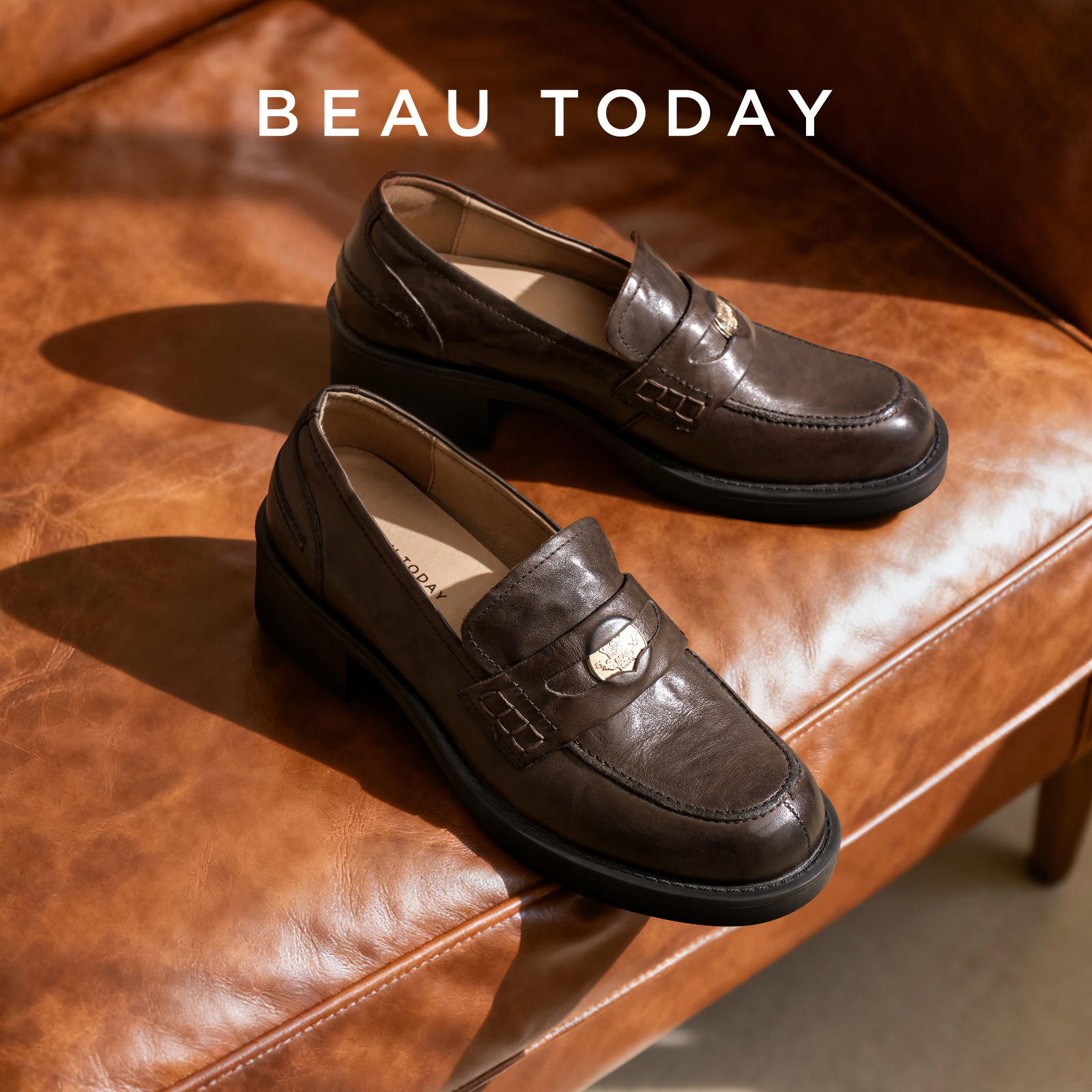 【焦糖金币】BeauToday厚底乐福鞋女真皮英伦风小皮鞋棕色单鞋,广东 佛山