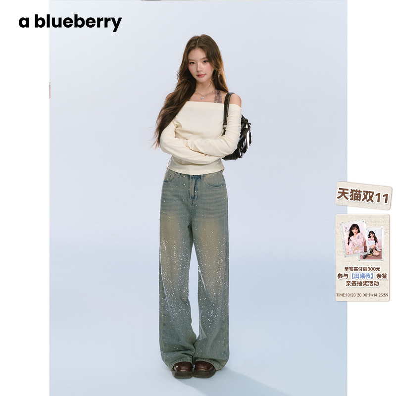 ablueberry 【爆闪裤】专柜热销 碎钻牛仔裤女秋高腰辣妹直筒长裤