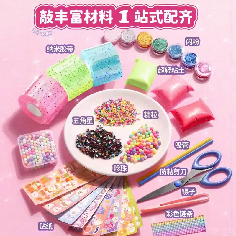 纳米胶捏捏乐吹泡泡套装手工diy自制解压玩具贴纸儿童生日礼物水球空气捏双面胶带女孩网红胶无毒材料豪华