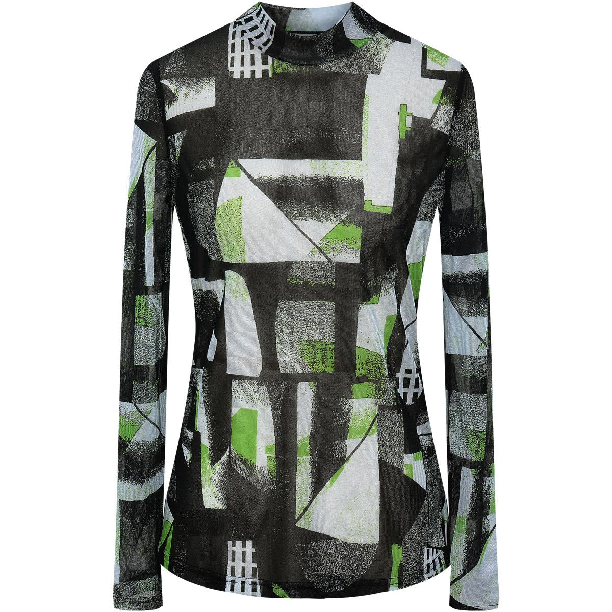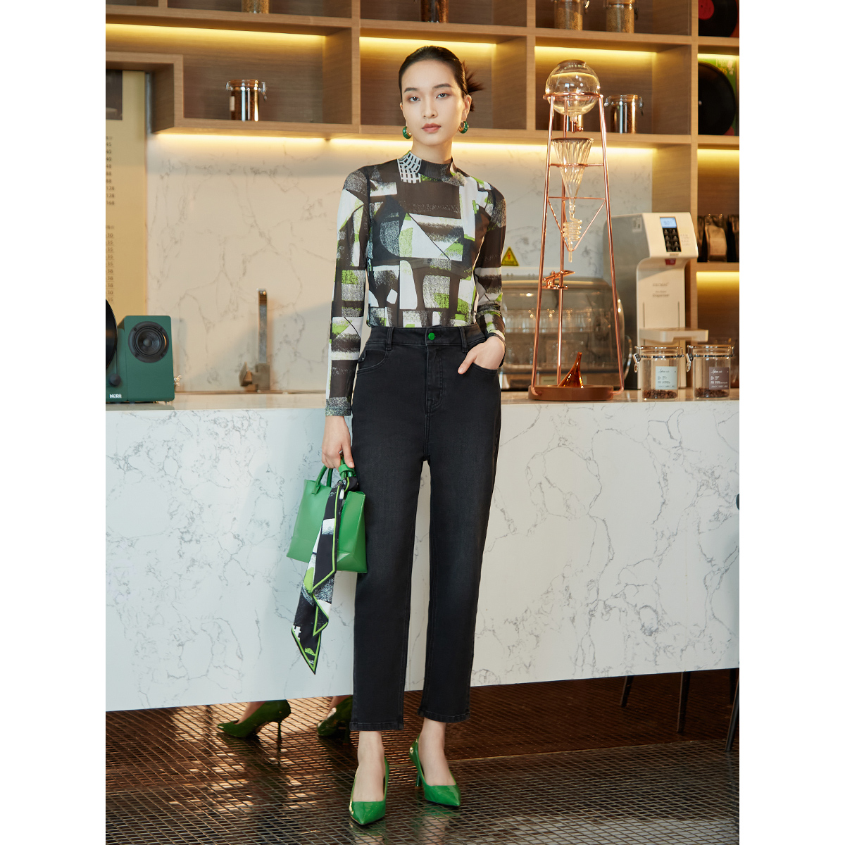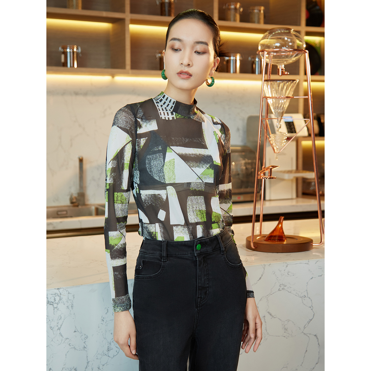 BBLLUUEE粉蓝衣橱复古艺术印花弹力网纱上衣女2025秋装打底皮肤衣,广东 深圳
