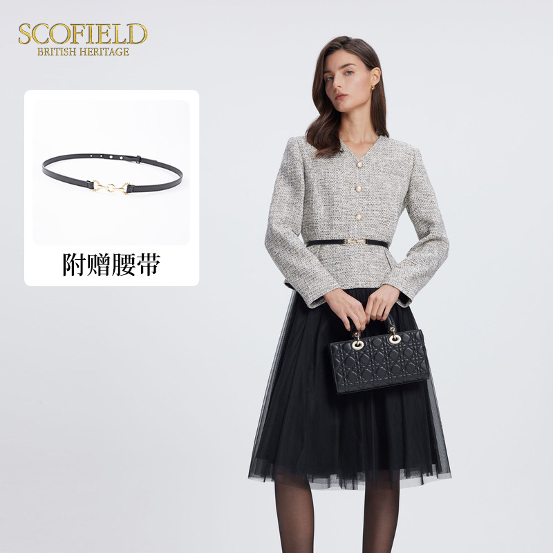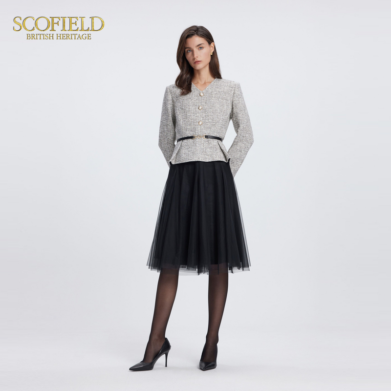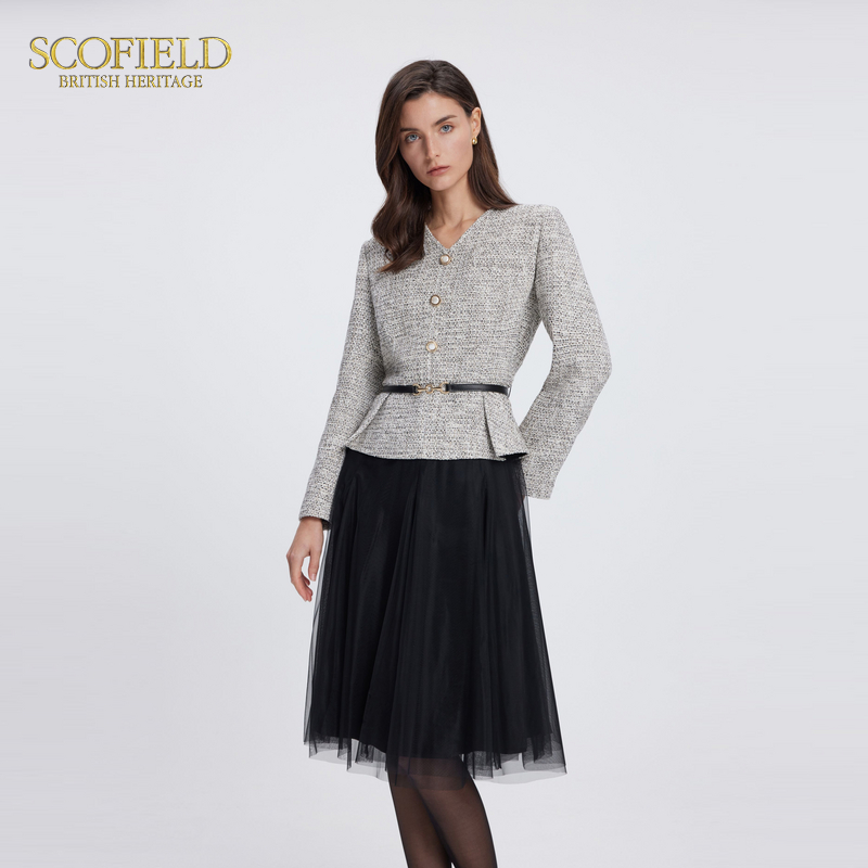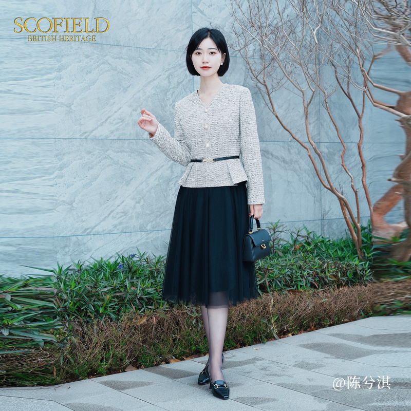 Scofield女装奢雅V领粗花呢网纱拼接收腰A摆连衣裙2025春季新品,上海