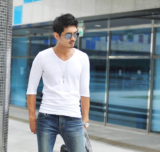 男装七分袖紧身莱卡棉T恤上衣 男V领7分袖体恤修身纯棉打底上衣,广东 惠州