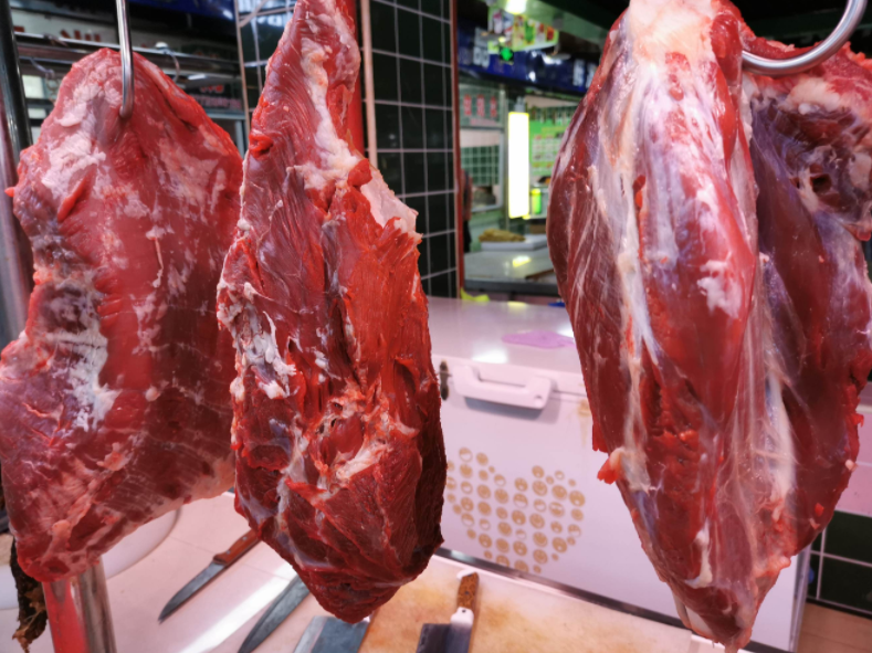 下面来说说,摆在案子上的牛肉和挂起来的牛肉有什么区别?这是辨别注水牛肉的一个方法。
