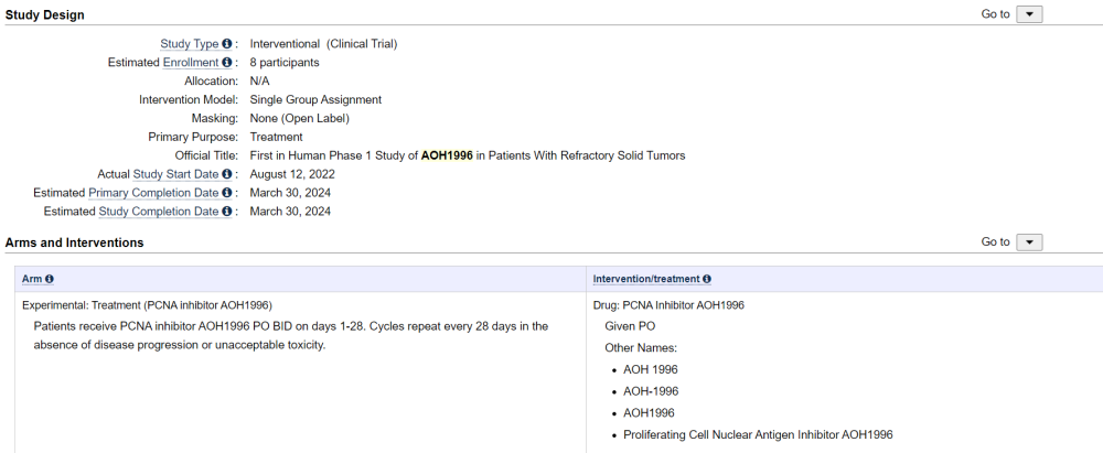 随着动物模型验证药物可行性后,AOH1996也已经进入Ⅰ期临床试验阶段,该阶段主要测试药物的安全性和推荐使用剂量等情况。根据美国临床试验资料库的数据显示,这个阶段的试验预期在明年3月底前结束。也就是说,大概在一年左右的时间里,我们就能看到这款药物在真实患者身上使用的数据。